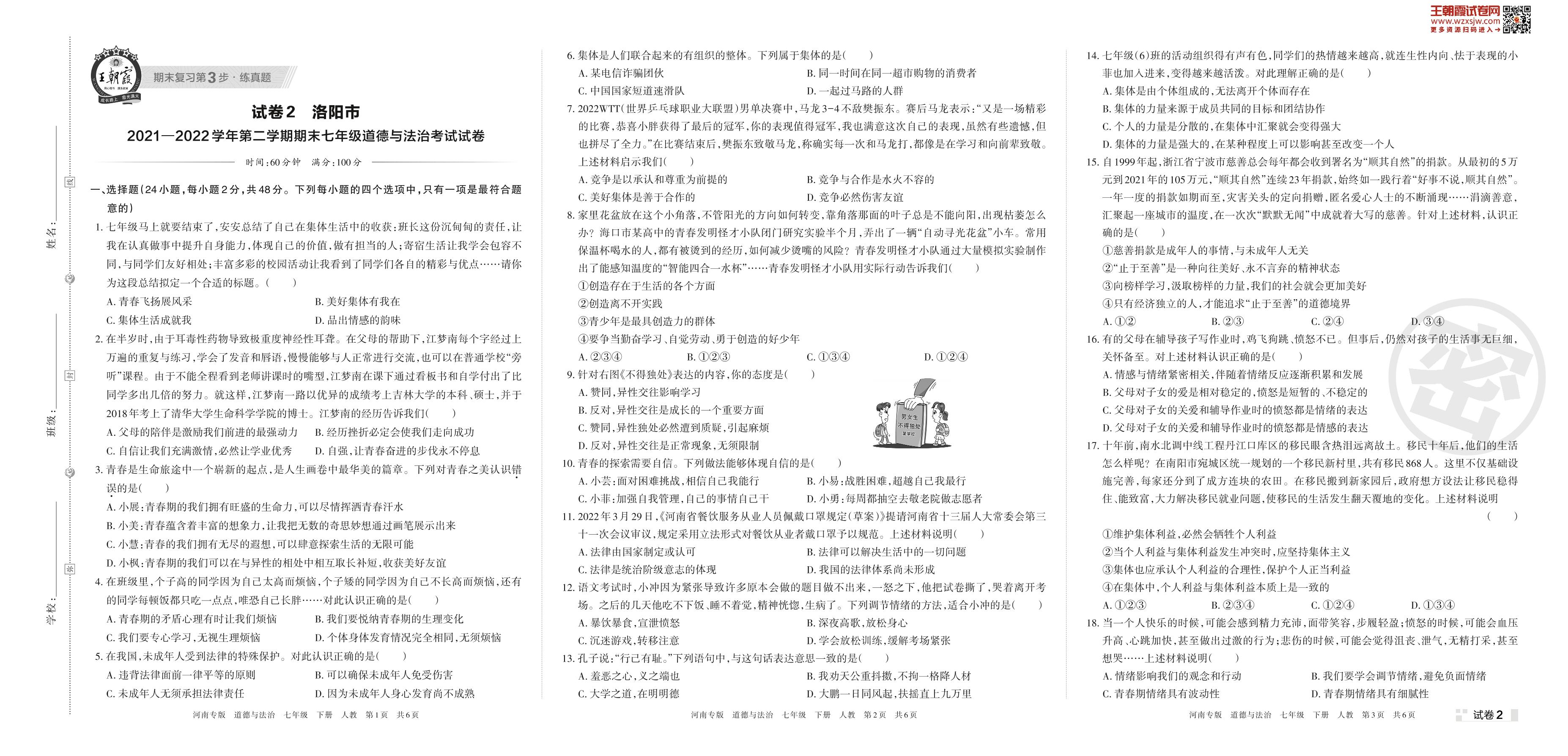 洛阳市2021—2022学年第二学期期末七年级道德与法治考试试卷(人教版)【2】