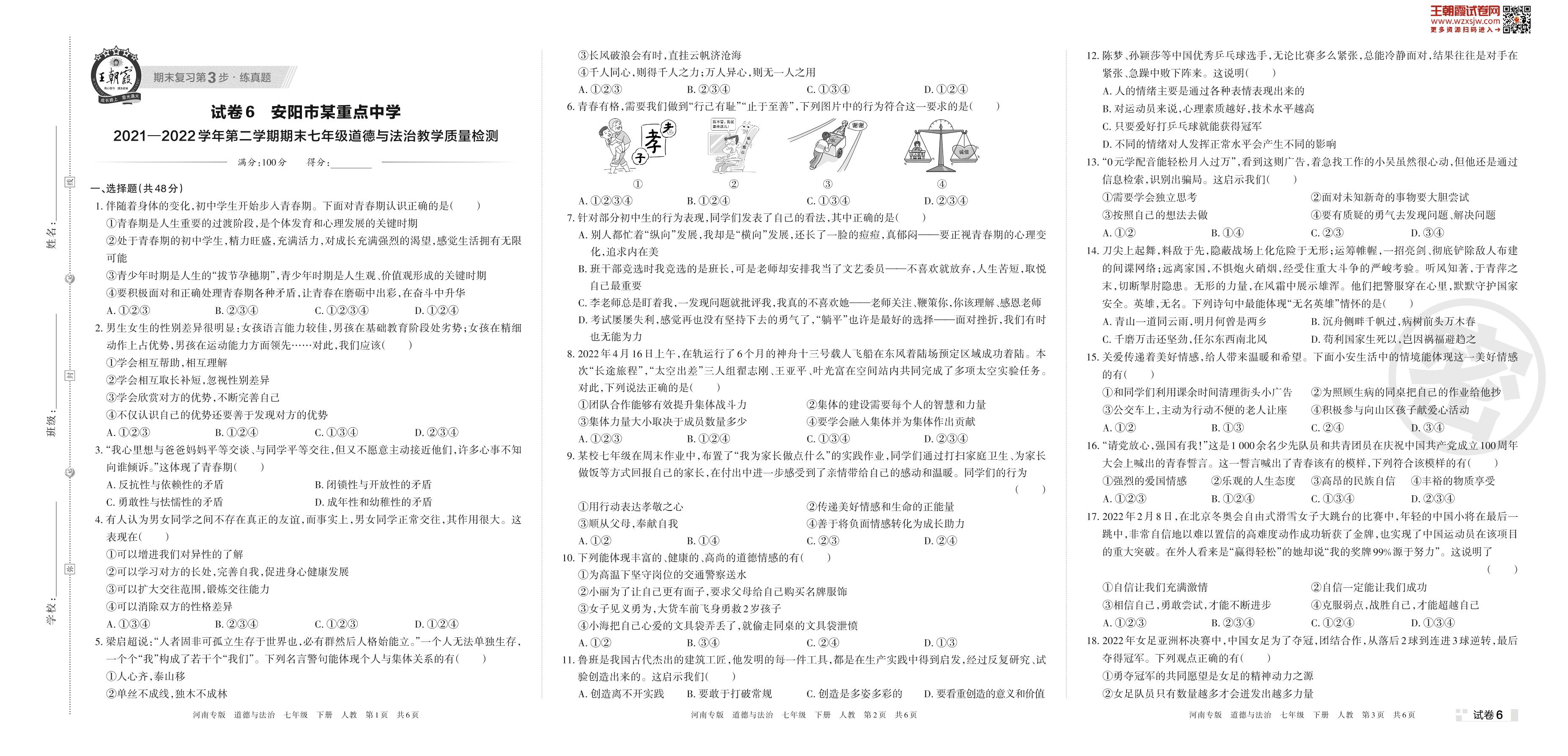 安阳市某重点中学2021—2022学年第二学期期末七年级道德与法治教学质量检测(人教版)【6】