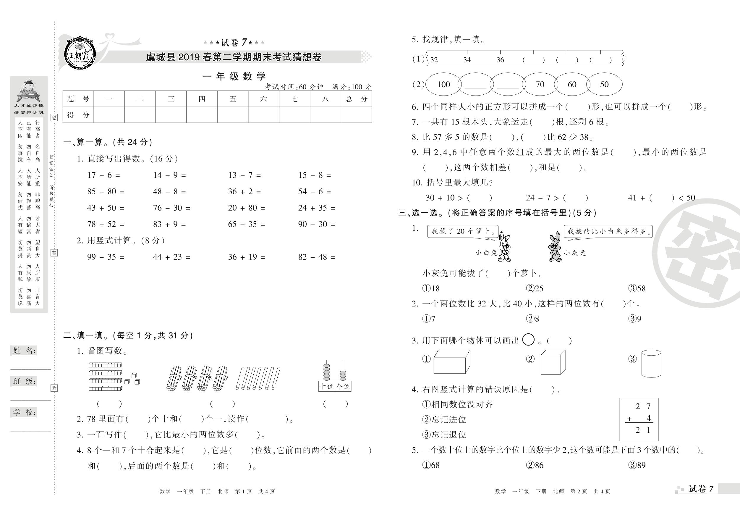 2018-2019学年第二学期商丘市虞城县猜想卷一年级数学试卷(北师版)【7】