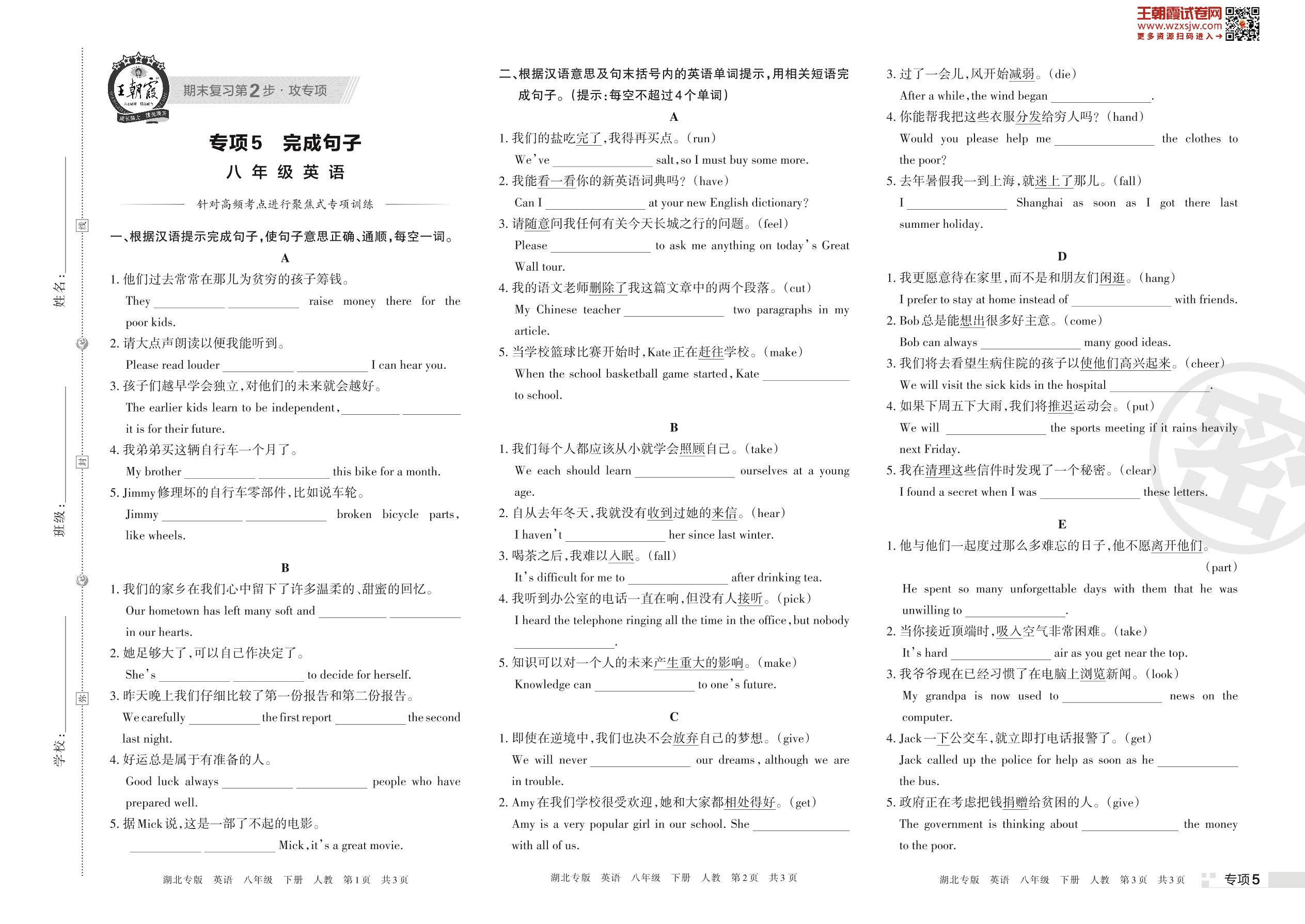 王朝霞期末专项卷——完成句子八年级下册英语(人教版)_R230426110255394【5】