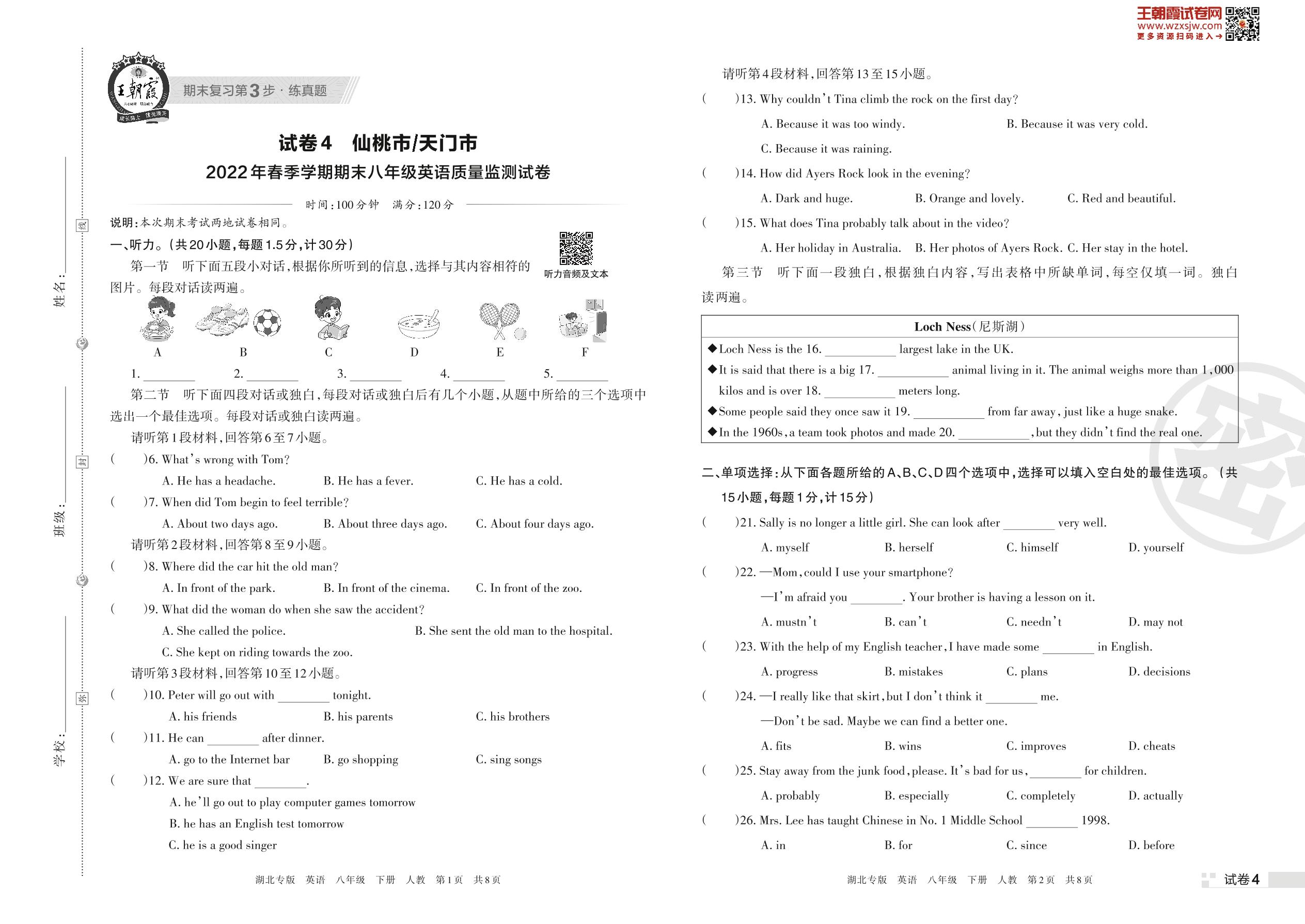 仙桃市(天门市)2022年春季学期期末八年级英语质量监测试(人教版)【4】