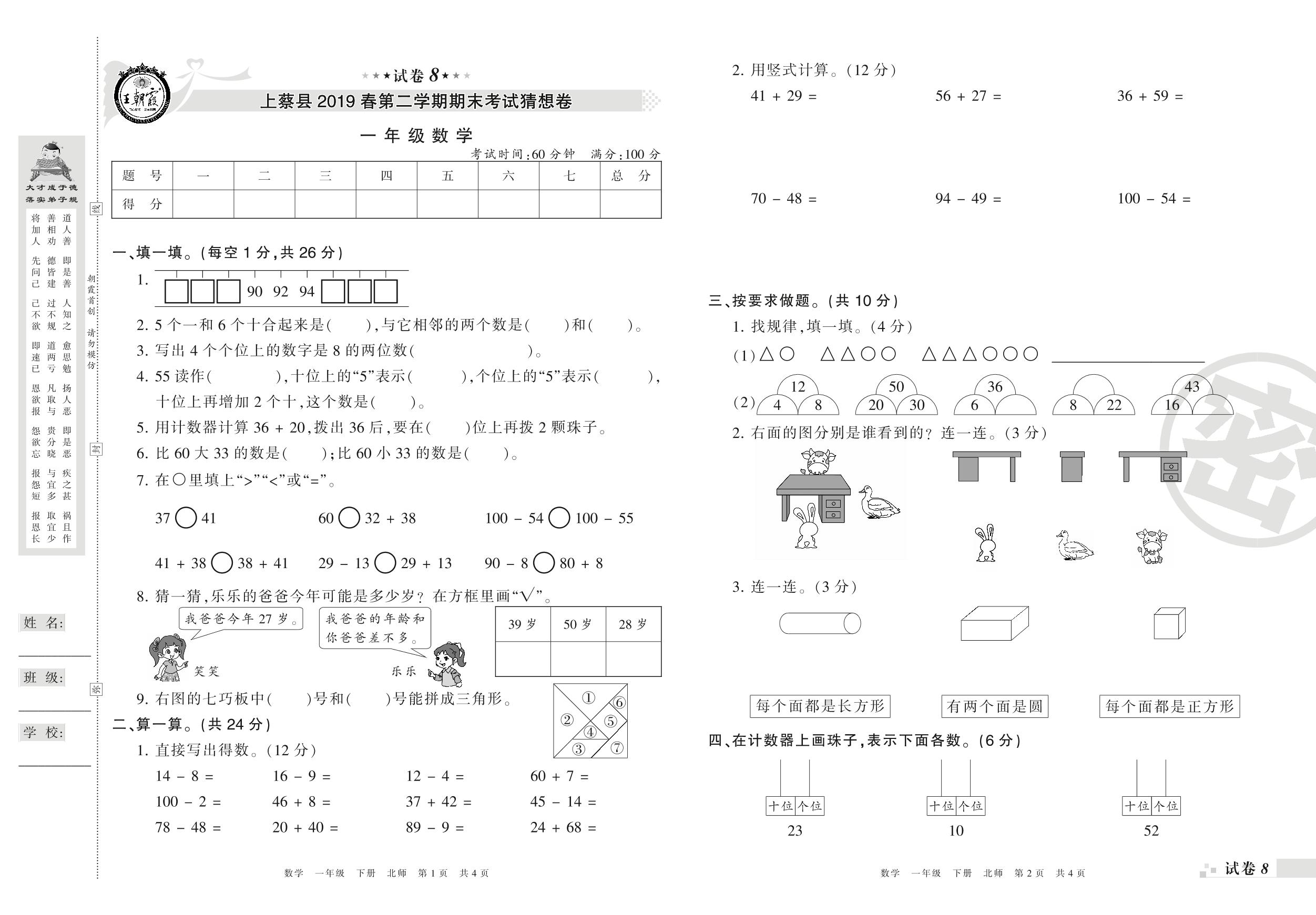 2018-2019学年第二学期驻马店市上蔡县猜想卷一年级数学试卷(北师版)【8】