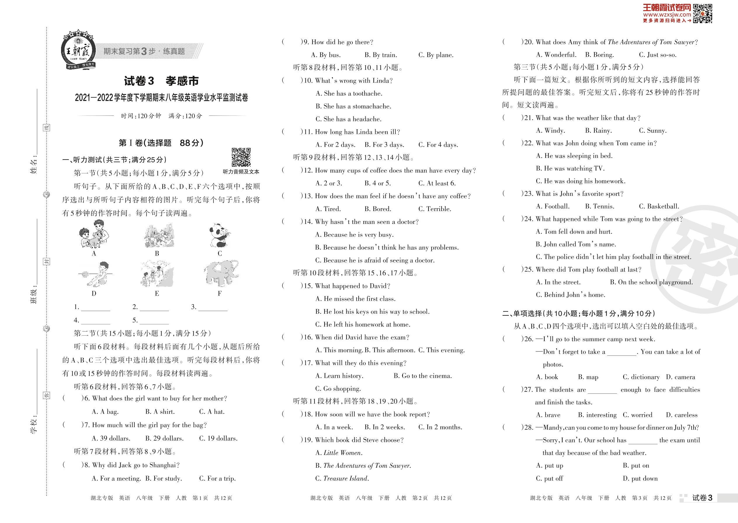 孝感市2021—2022学年度下学期期末八年级英语学业水平监测试卷(人教版)【3】