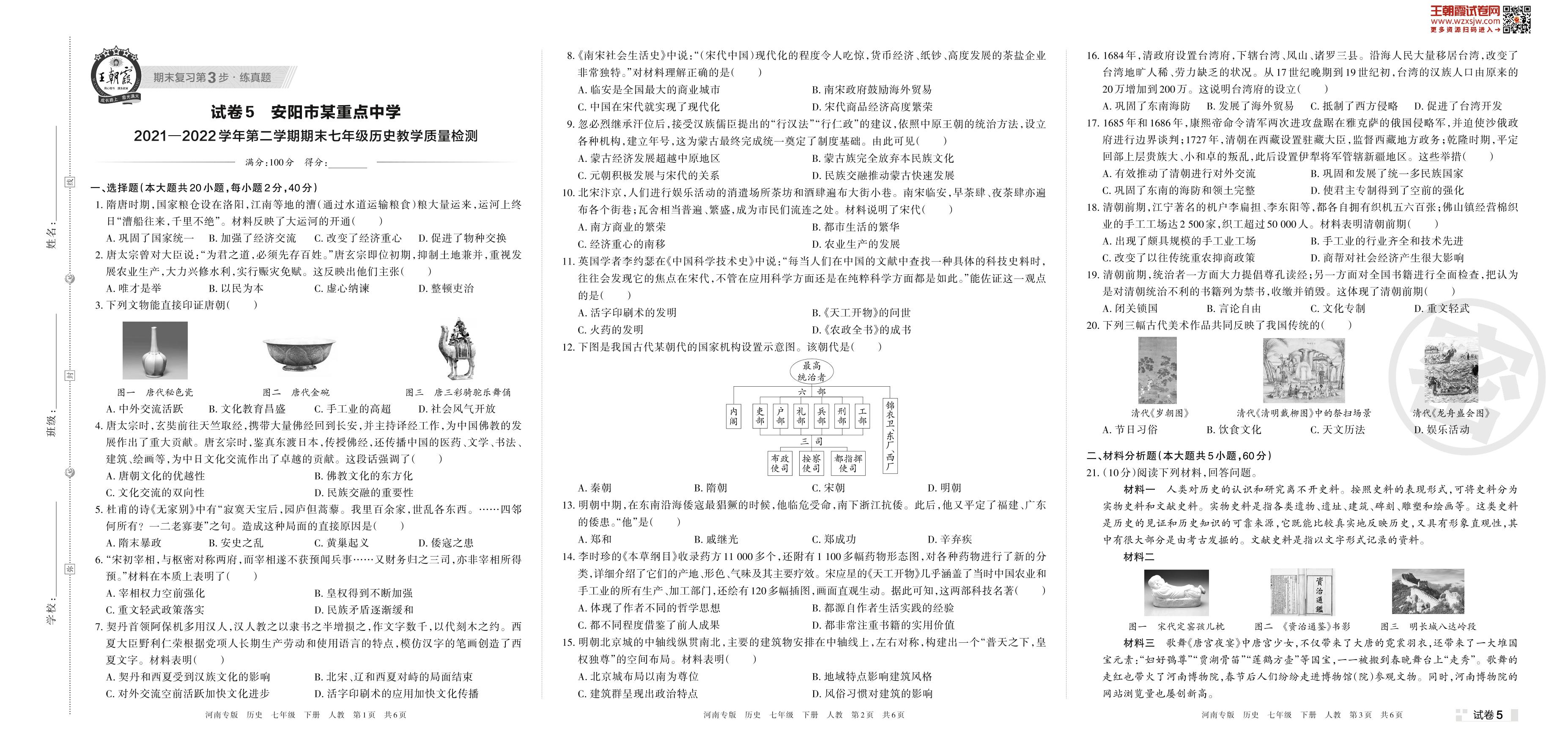 安阳市某重点中学2021—2022学年第二学期期末七年级历史教学质量检测(人教版)【5】
