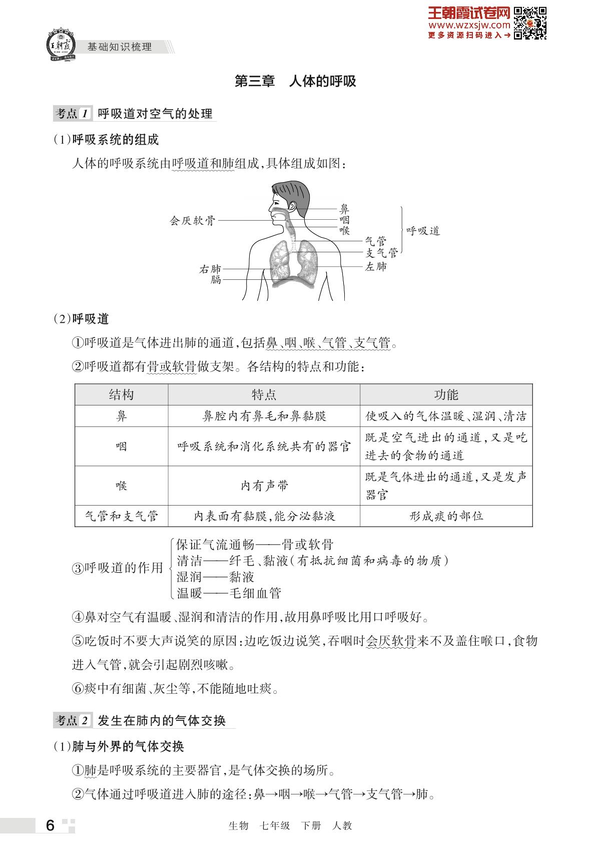 王朝霞期末知识梳理——第三章 人体的呼吸七年级下册生物(人教版)