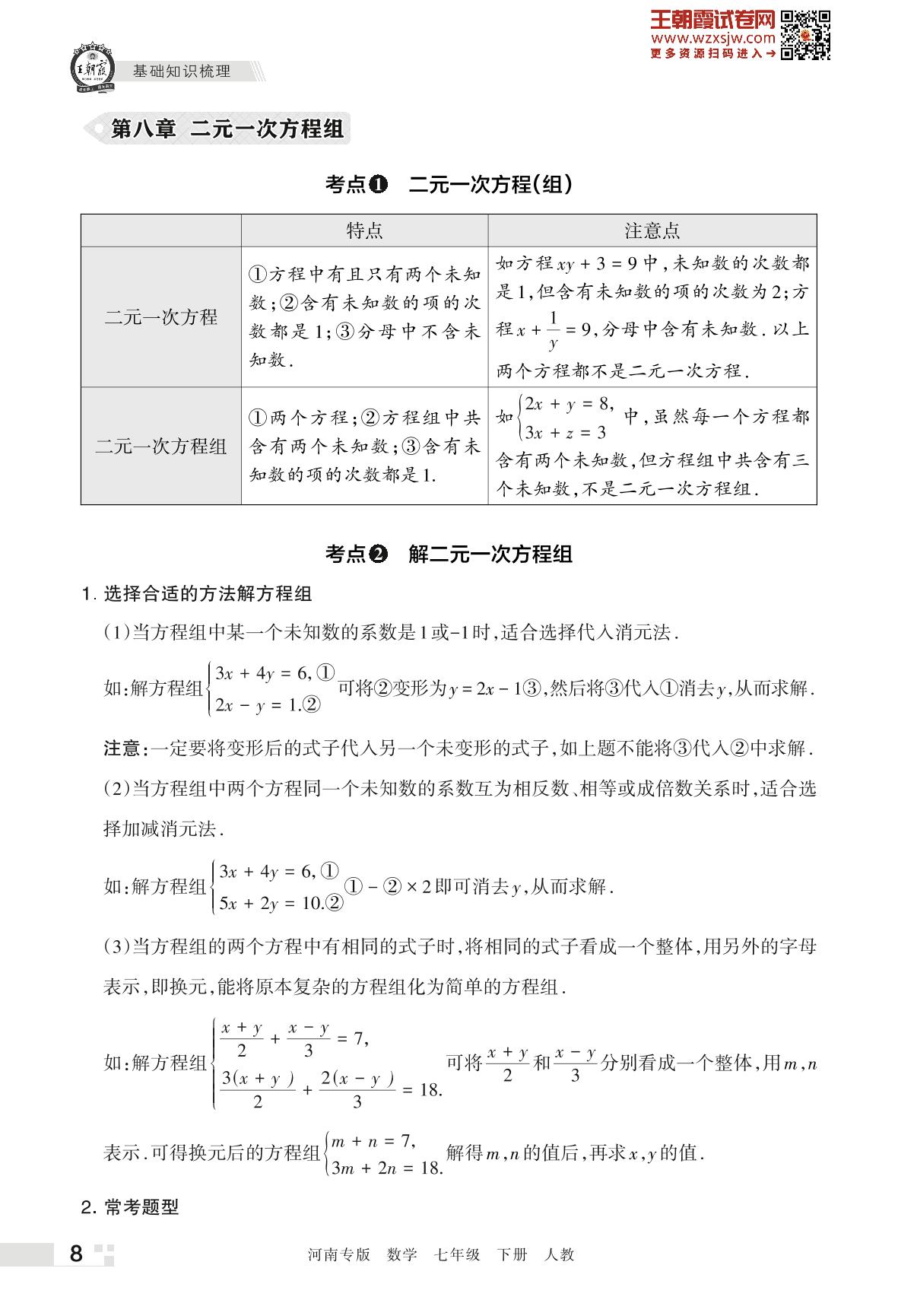 王朝霞期末知识梳理——第八章 二元一次方程组七年级下册数学(人教版)_R230426112614089