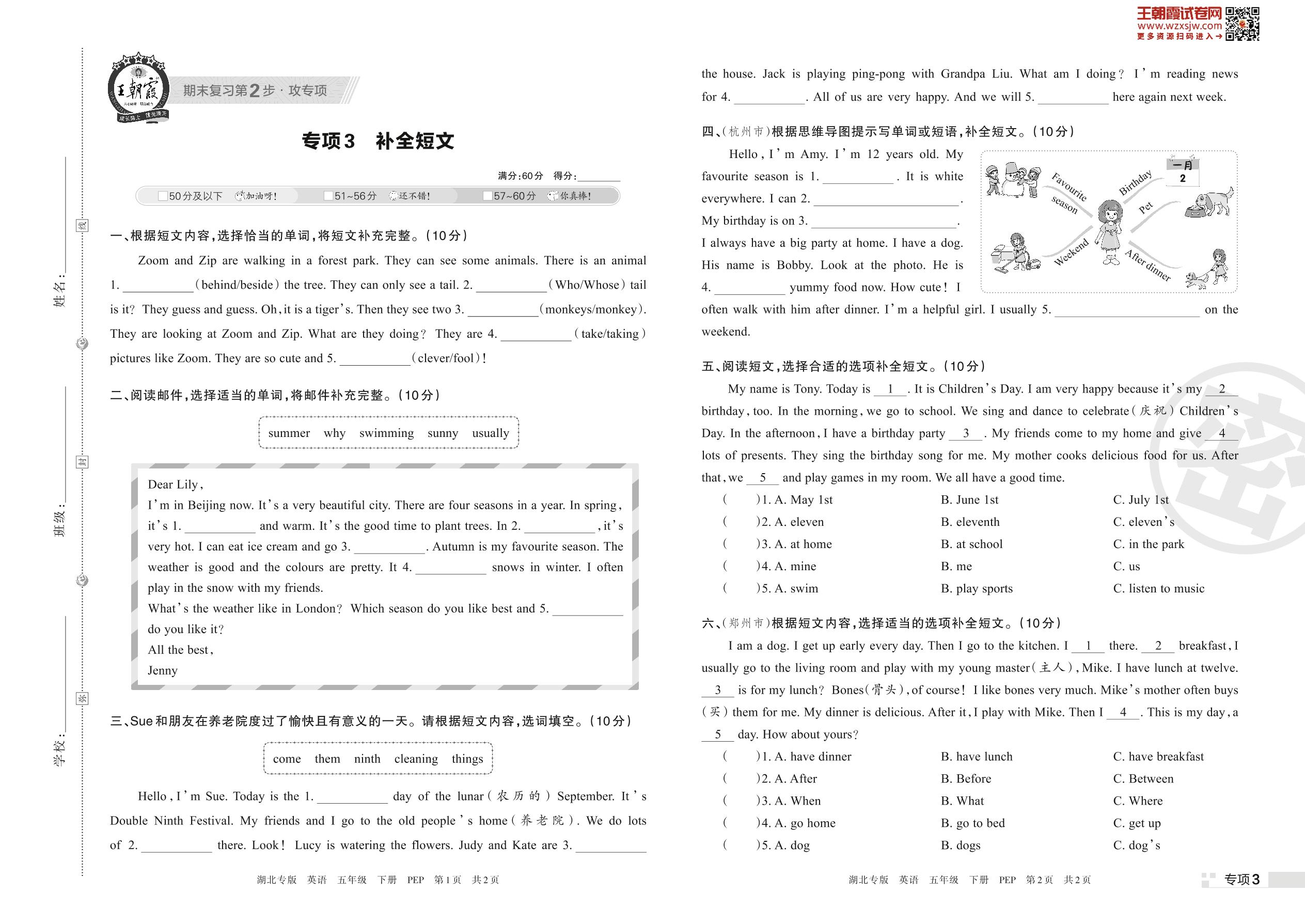 王朝霞期末专项卷——补全短文五年级下册英语(PEP版)_R230426113002803【3】