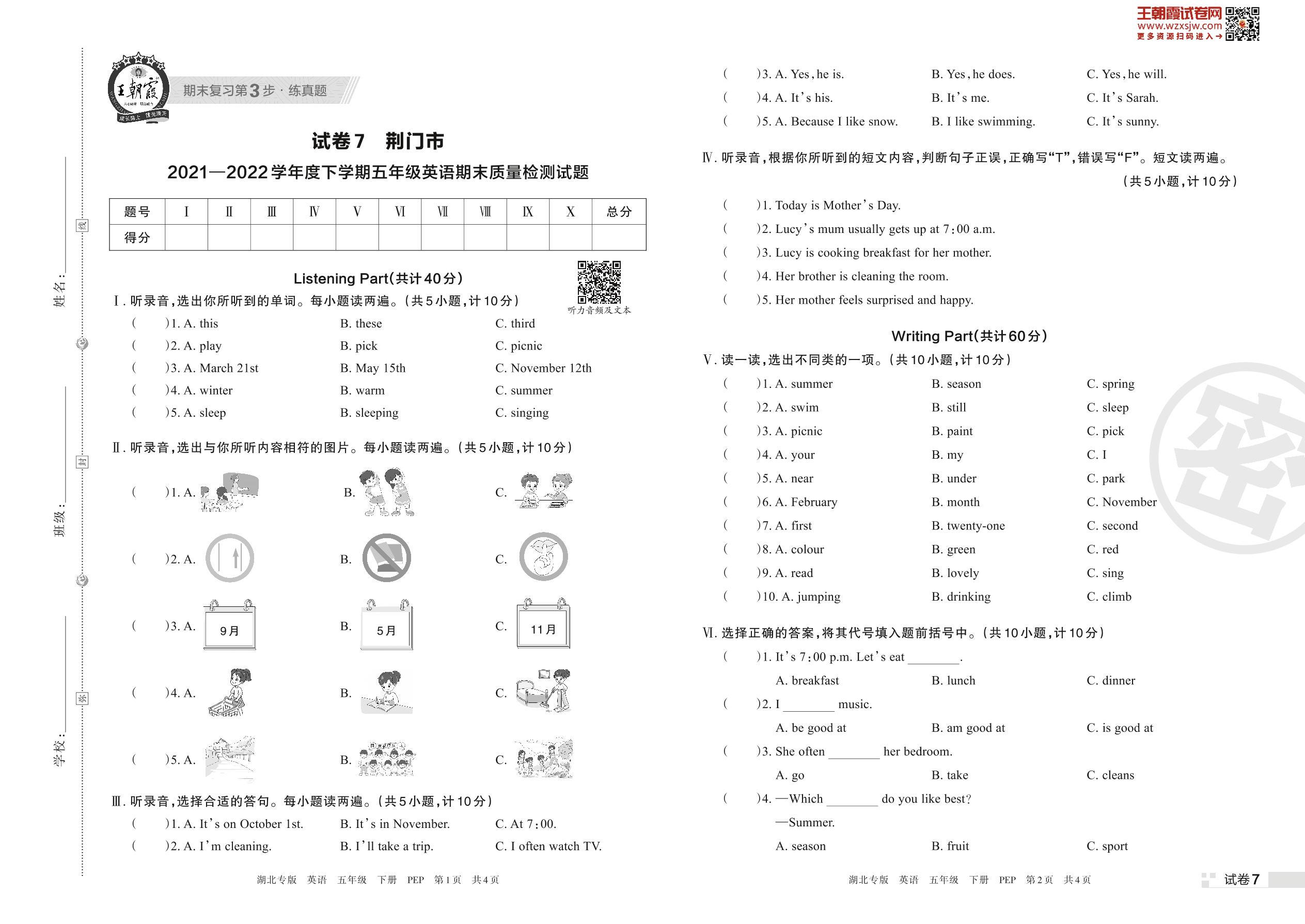 荆门市2021—2022学年度下学期五年级英语期末质量检测试题(PEP版)【7】