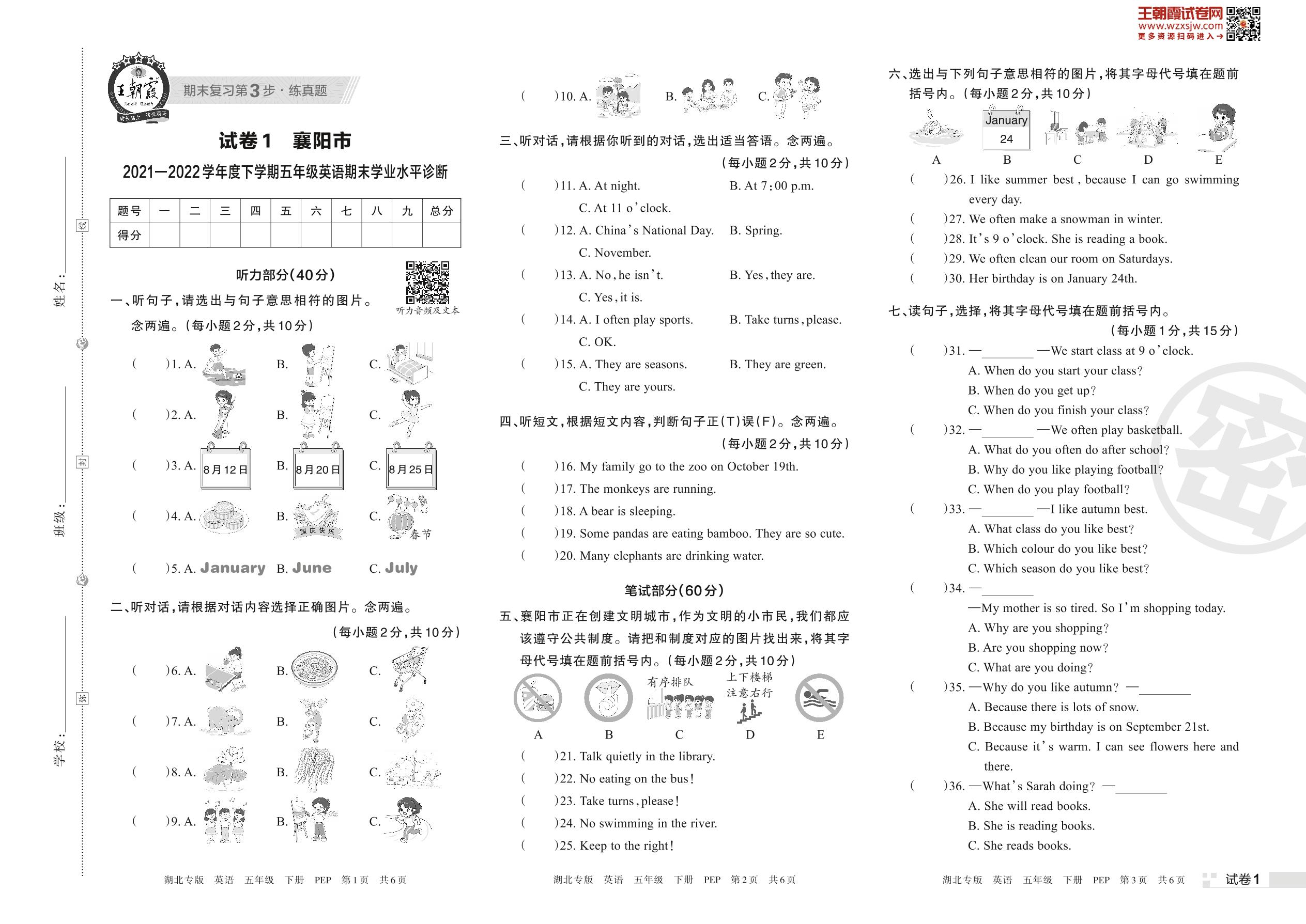 襄阳市2021—2022学年度下学期五年级英语期末学业水平诊断(PEP版)【1】