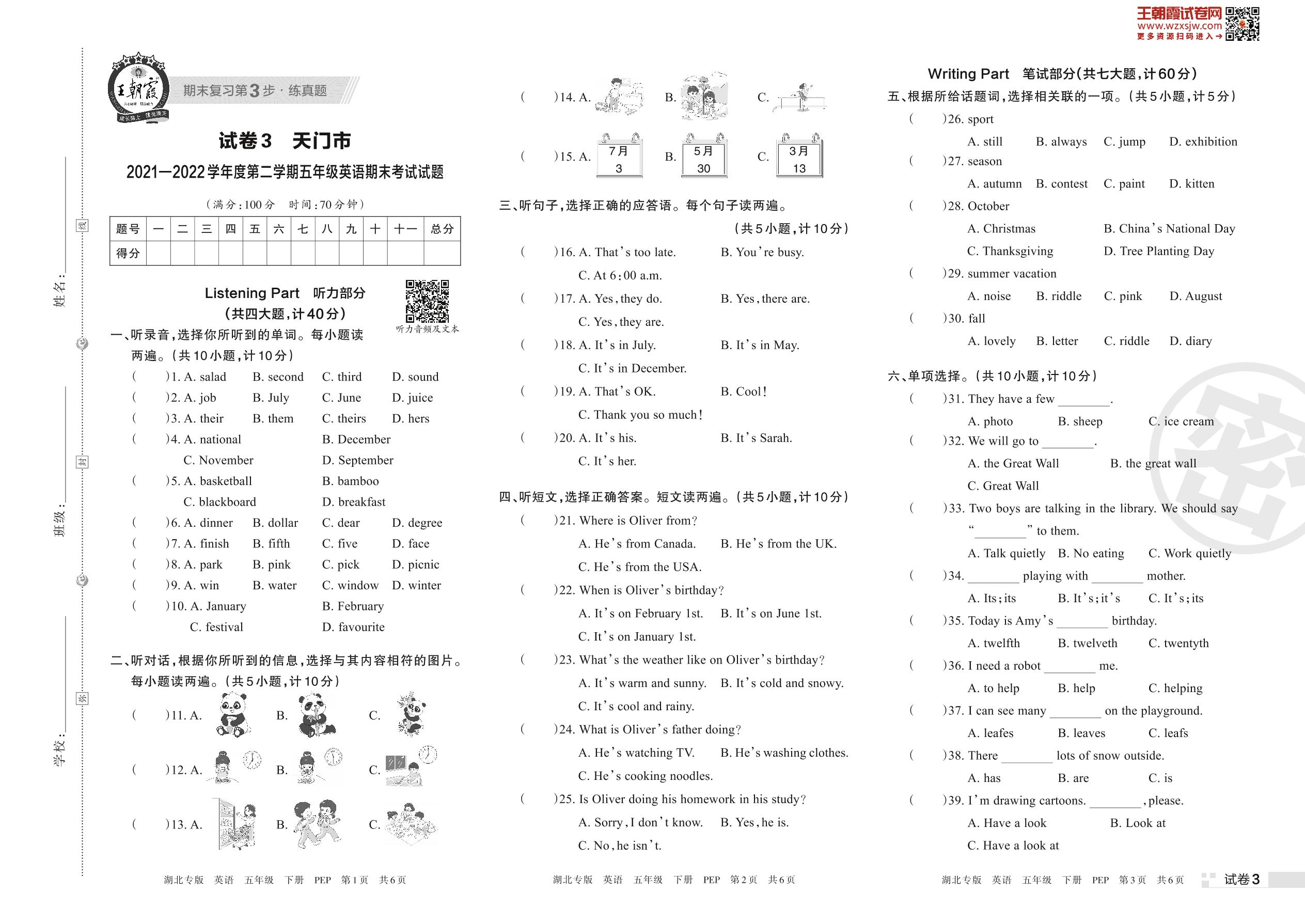 天门市2021—2022学年度第二学期五年级英语期末考试试题(PEP版)【3】