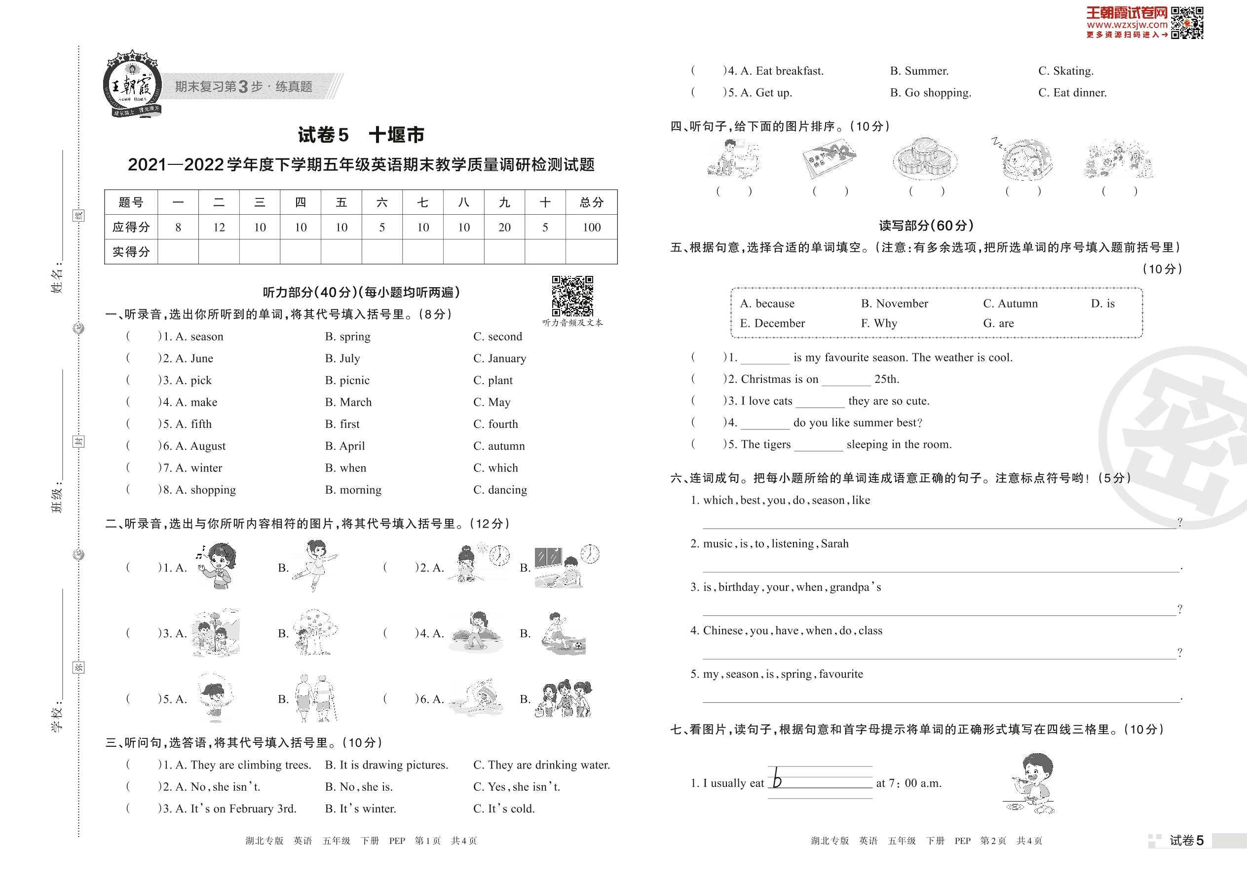 十堰市2021—2022学年度下学期五年级英语期末教学质量调研检测试题(PEP版)【5】