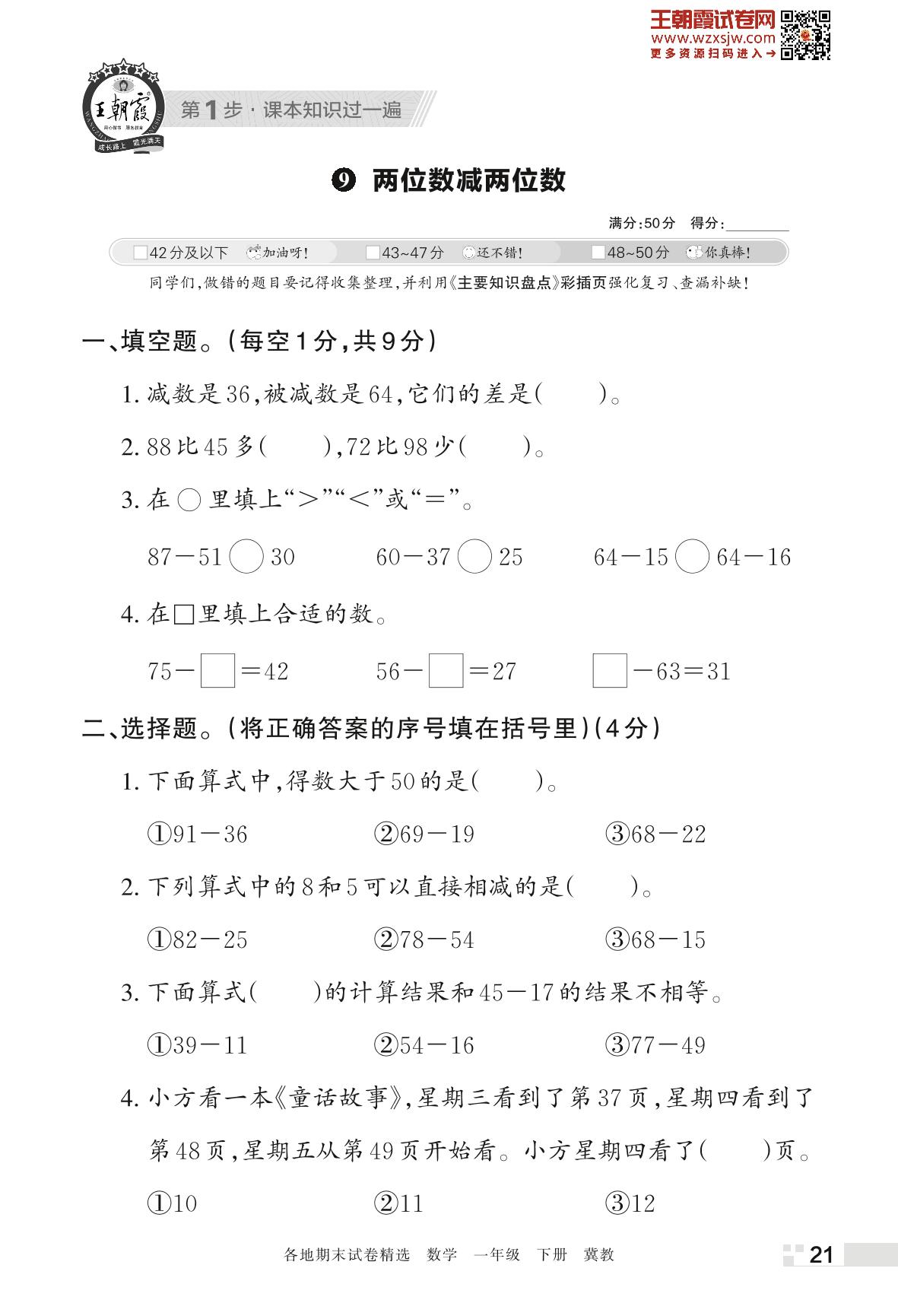 王朝霞期末过课本——9 两位数减两位数一年级下册数学(冀教版)