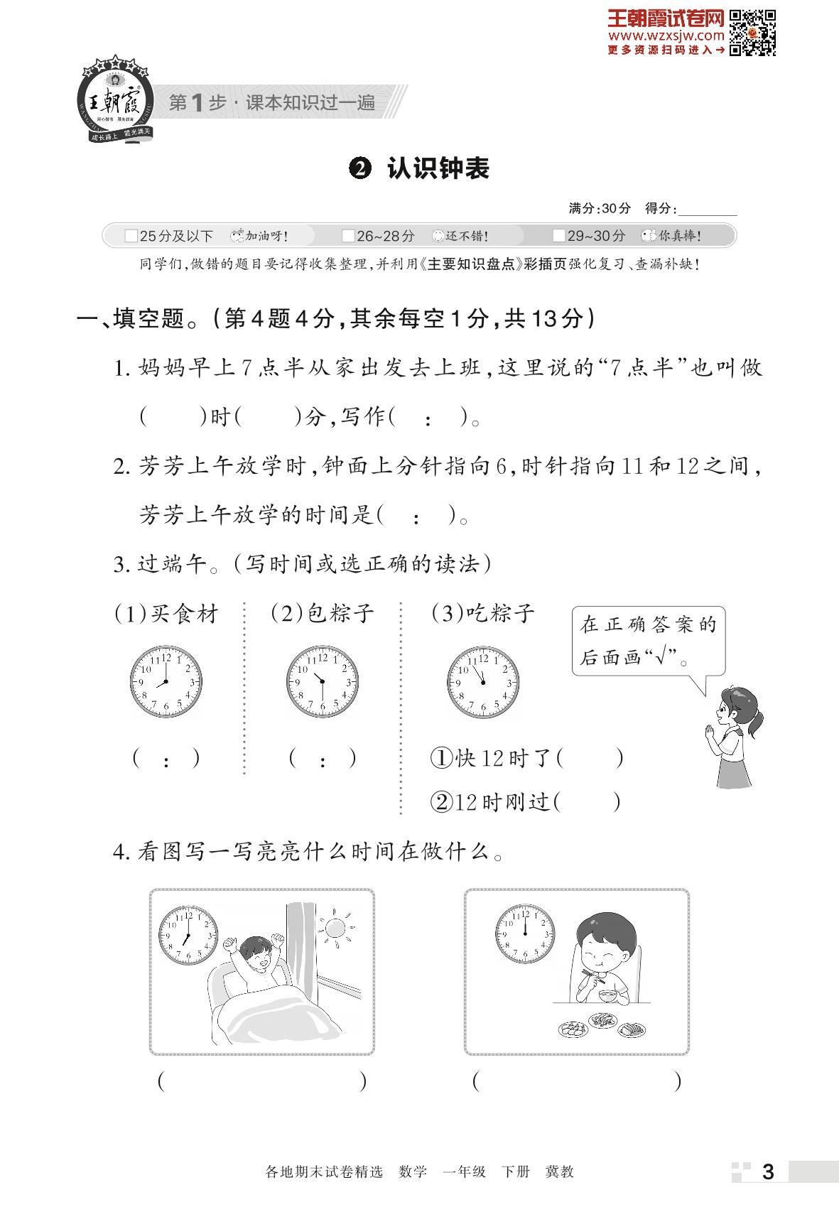 王朝霞期末过课本——2 认识钟表一年级下册数学(冀教版)