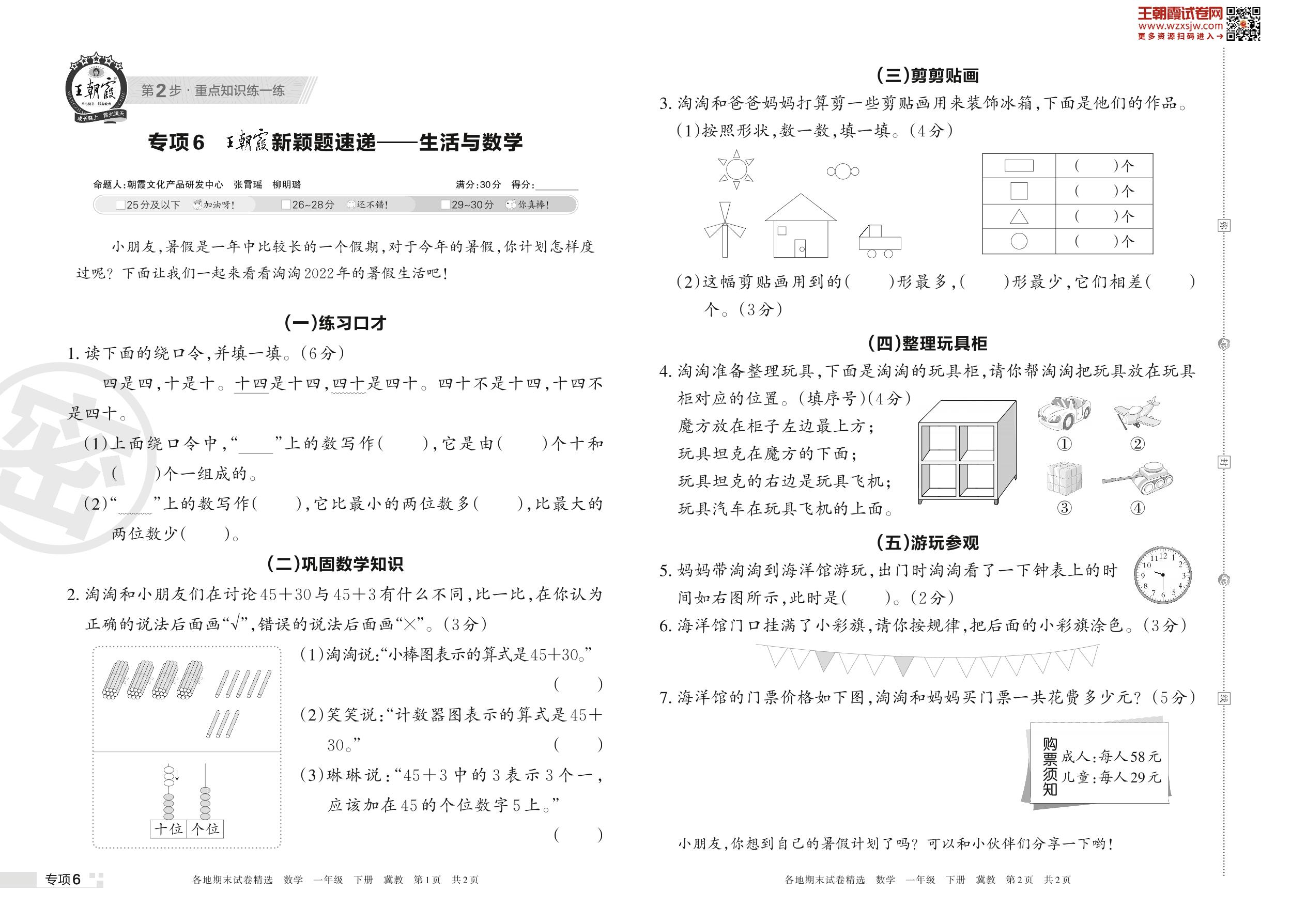 王朝霞期末专项卷——王朝霞新颖题速递:生活与数学一年级下册数学(冀教版)【6】