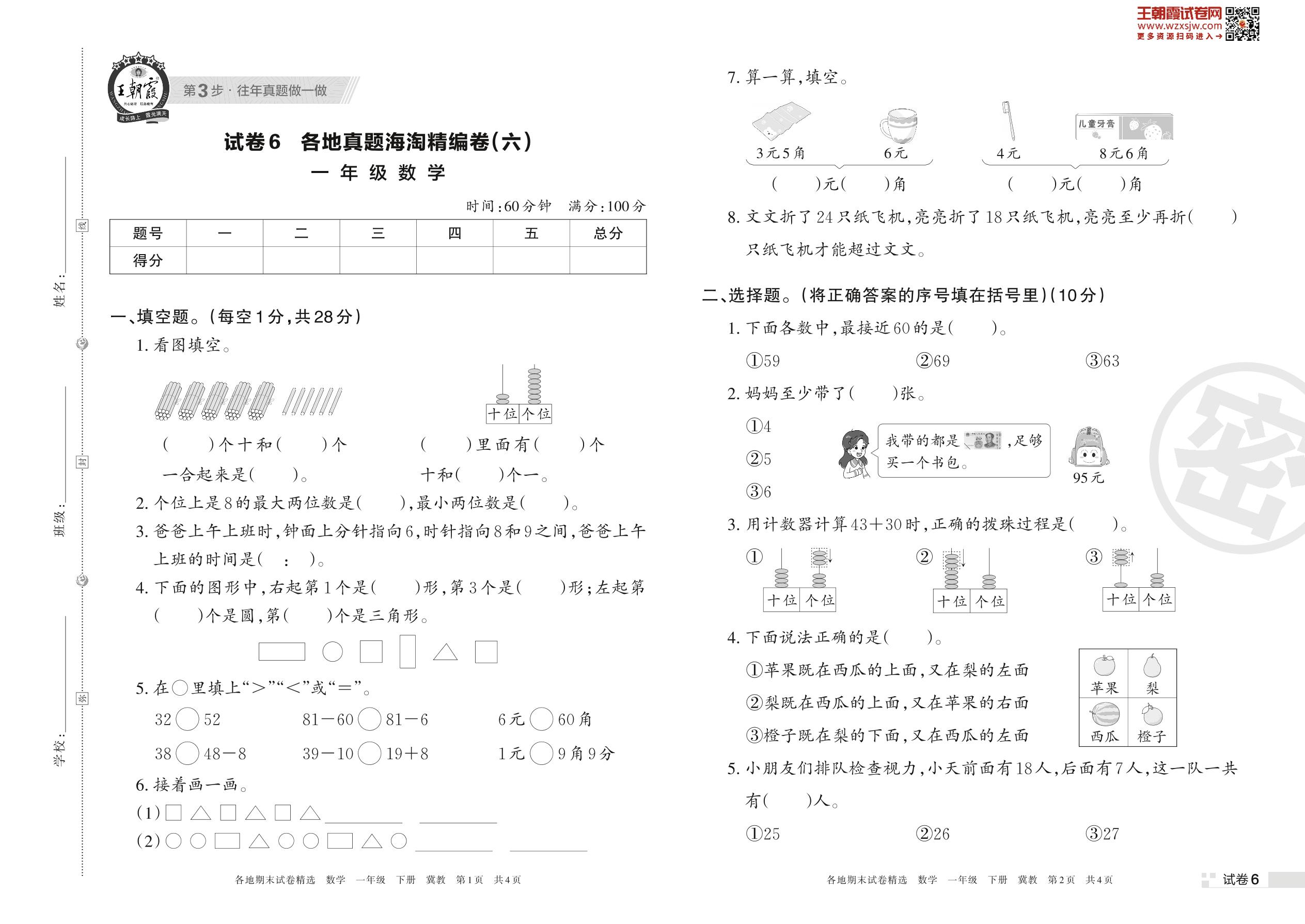 一年级数学冀教版下册期末卷