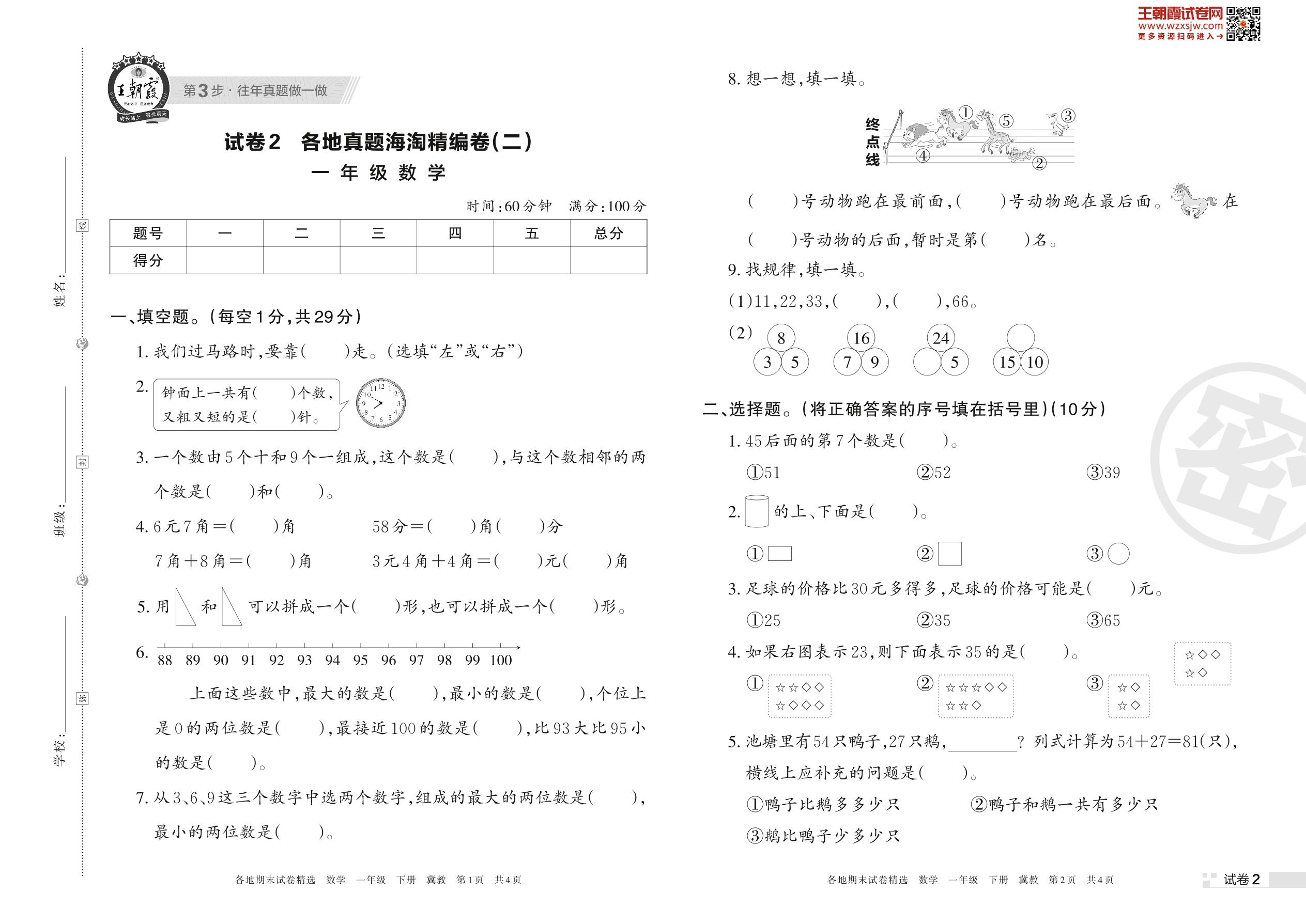 一年级数学冀教版下册期末卷
