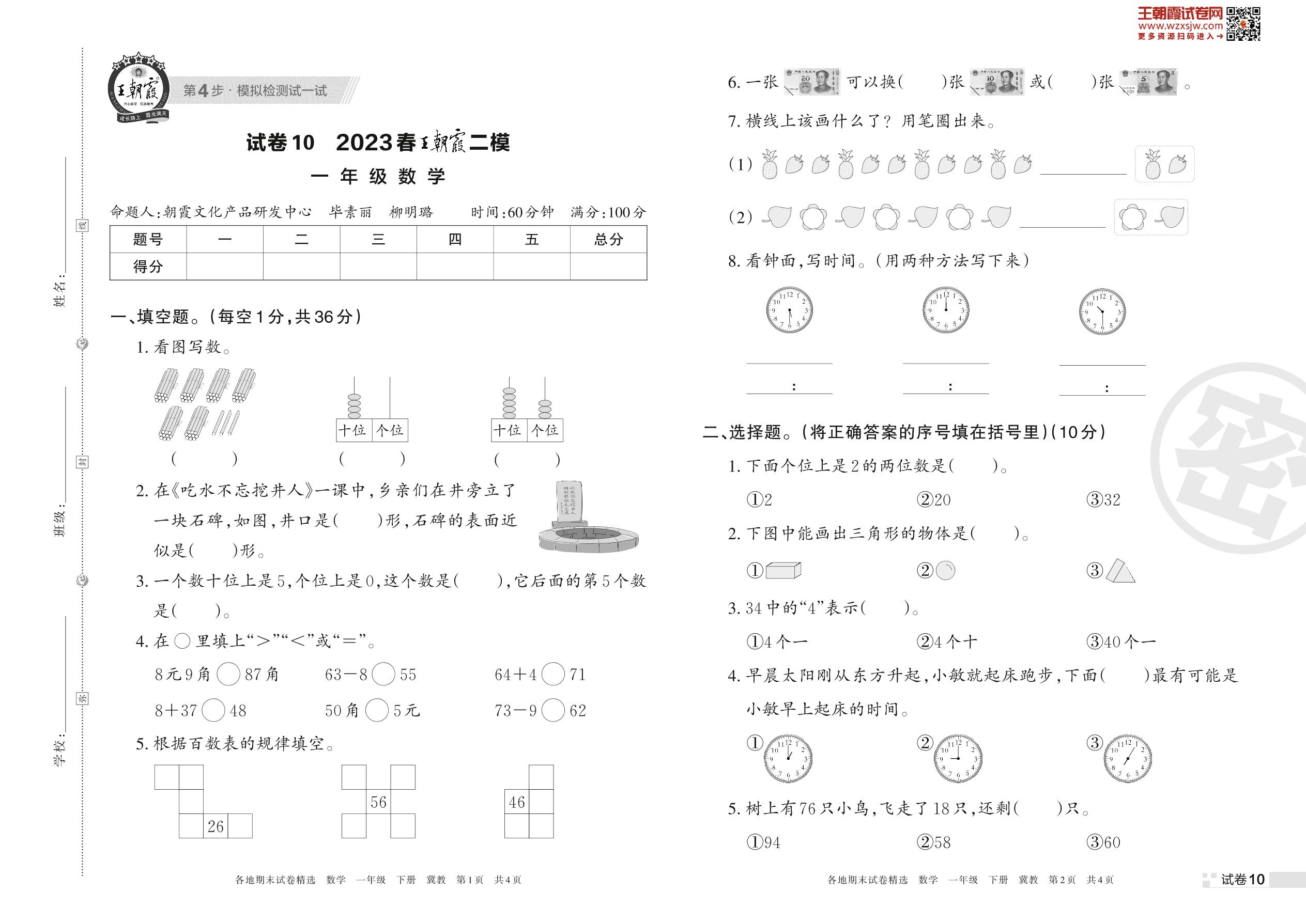 王朝霞期末模拟卷一年级下册数学(冀教版)_R230426135525221【10】