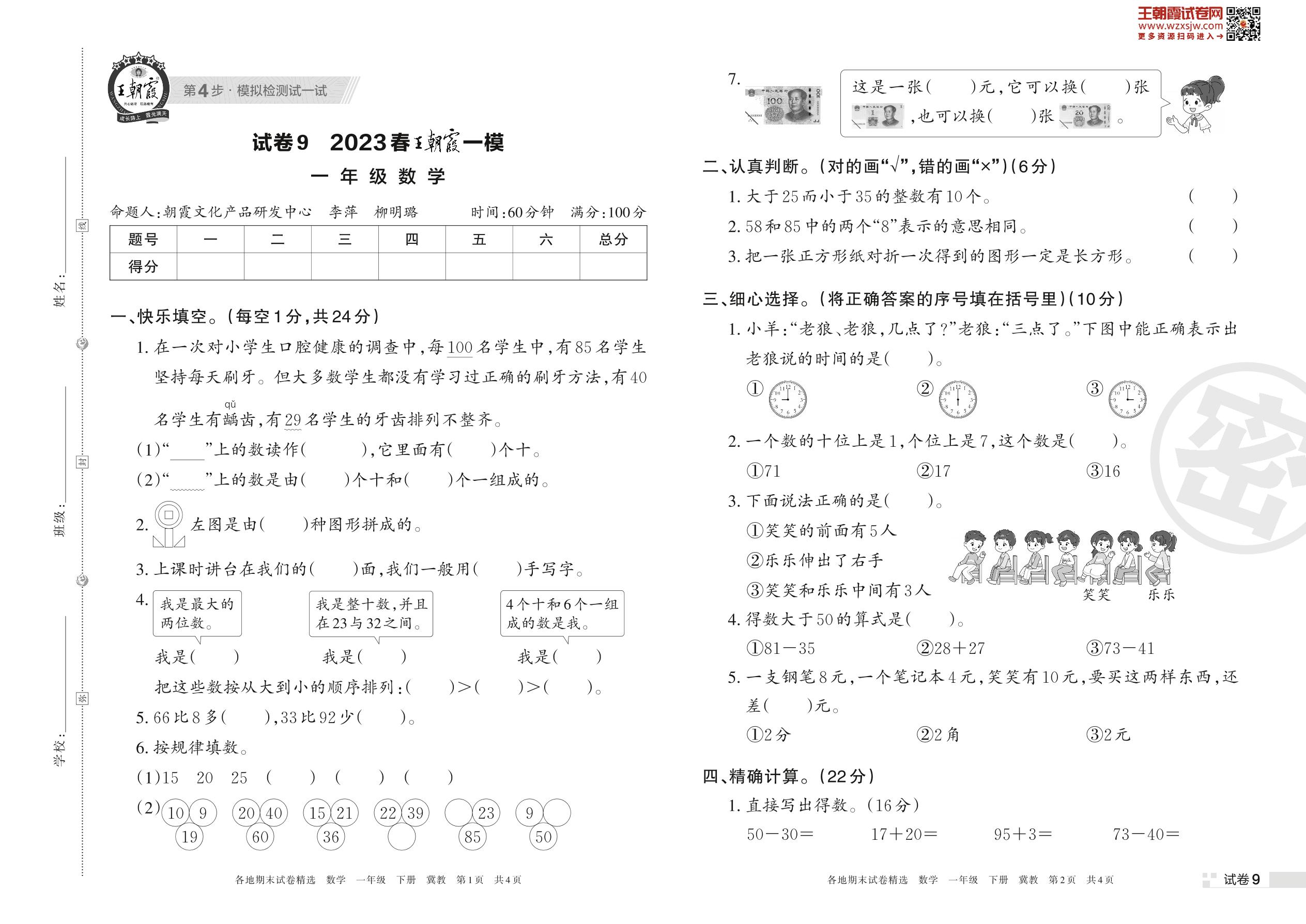 王朝霞期末模拟卷一年级下册数学(冀教版)【9】