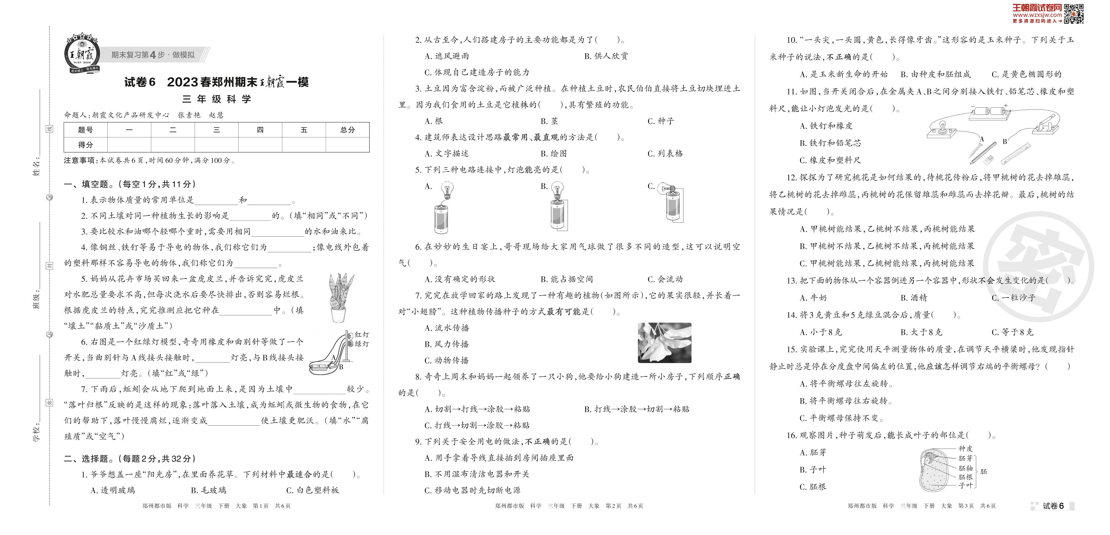 王朝霞期末模拟卷三年级下册科学(大象版)_R230426140419798【6】