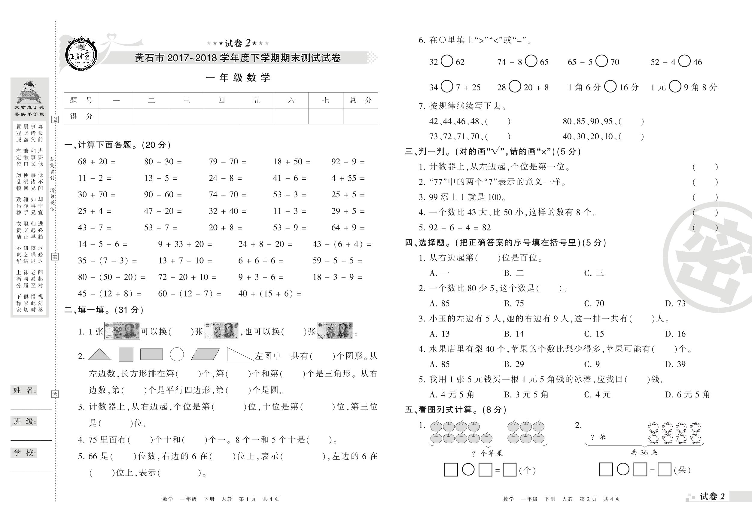 2017-2018学年第二学期黄石市一年级数学试卷(人教版)【2】