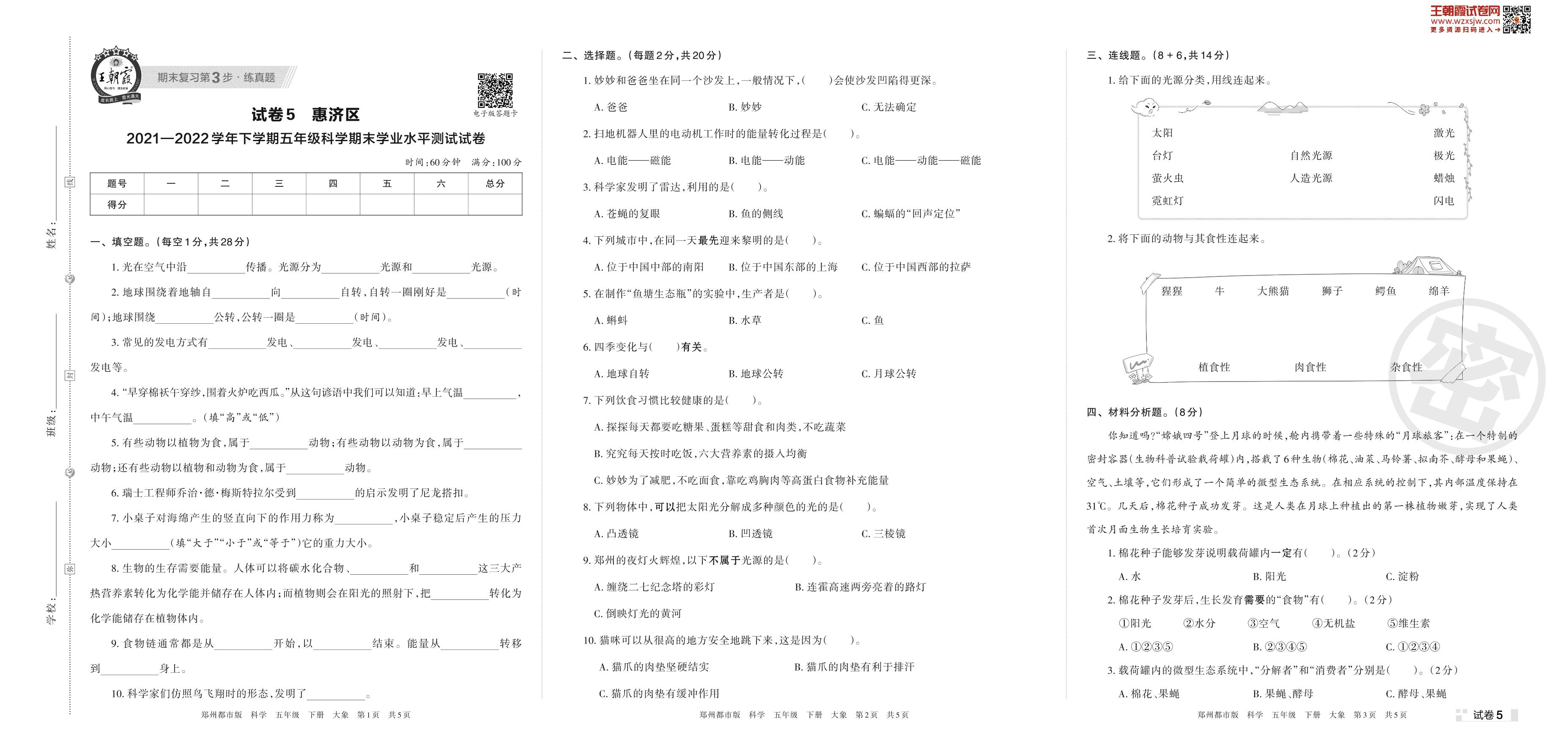 惠济区2021—2022学年下学期五年级科学期末学业水平测试试卷(大象版)【5】