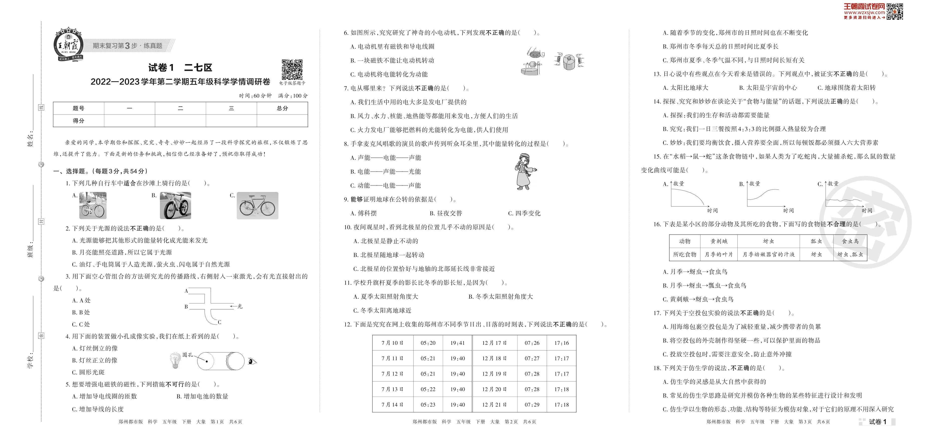 二七区2022—2023学年第二学期五年级科学学情调研卷(大象版)【1】