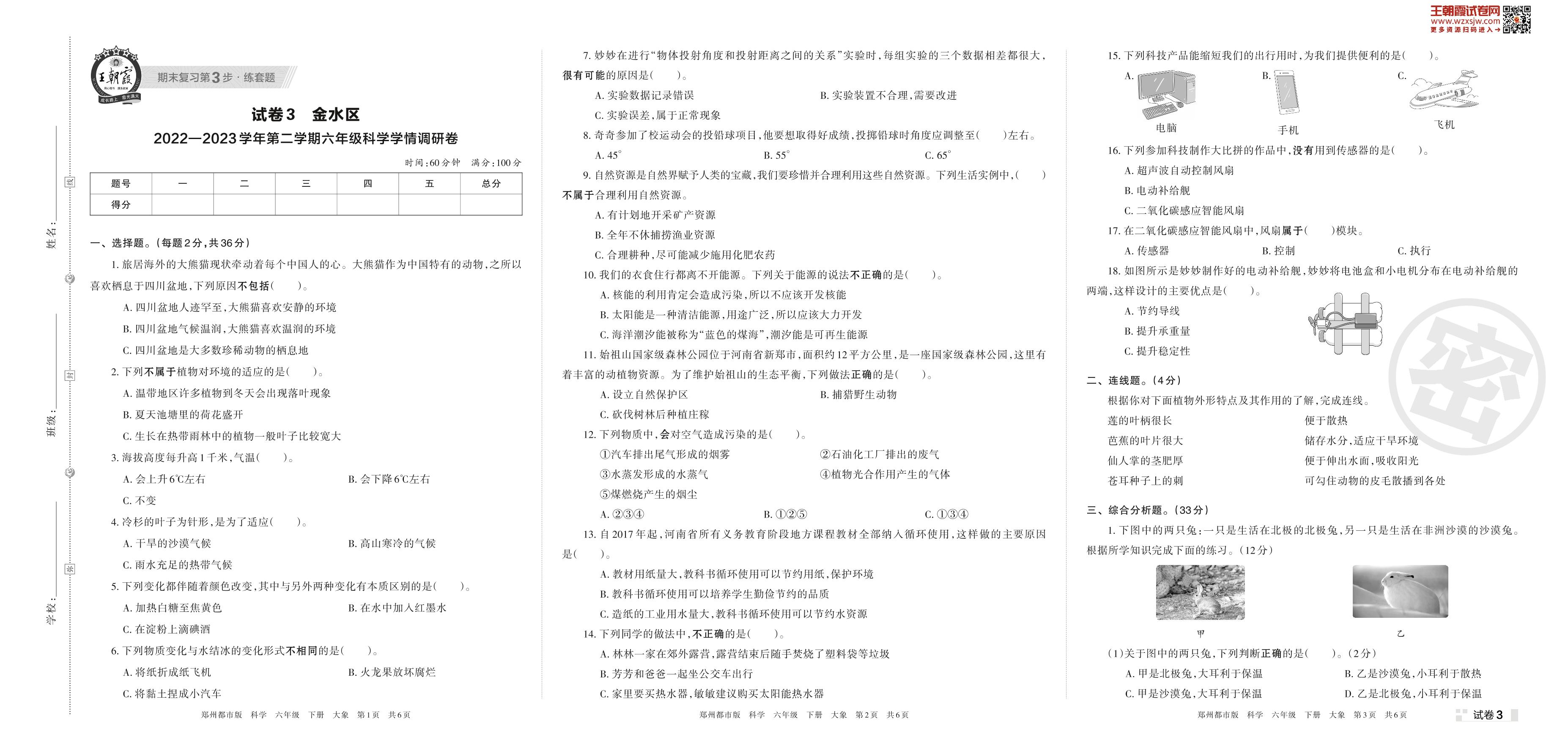 金水区2022—2023学年第二学期六年级科学学情调研卷(大象版)【3】
