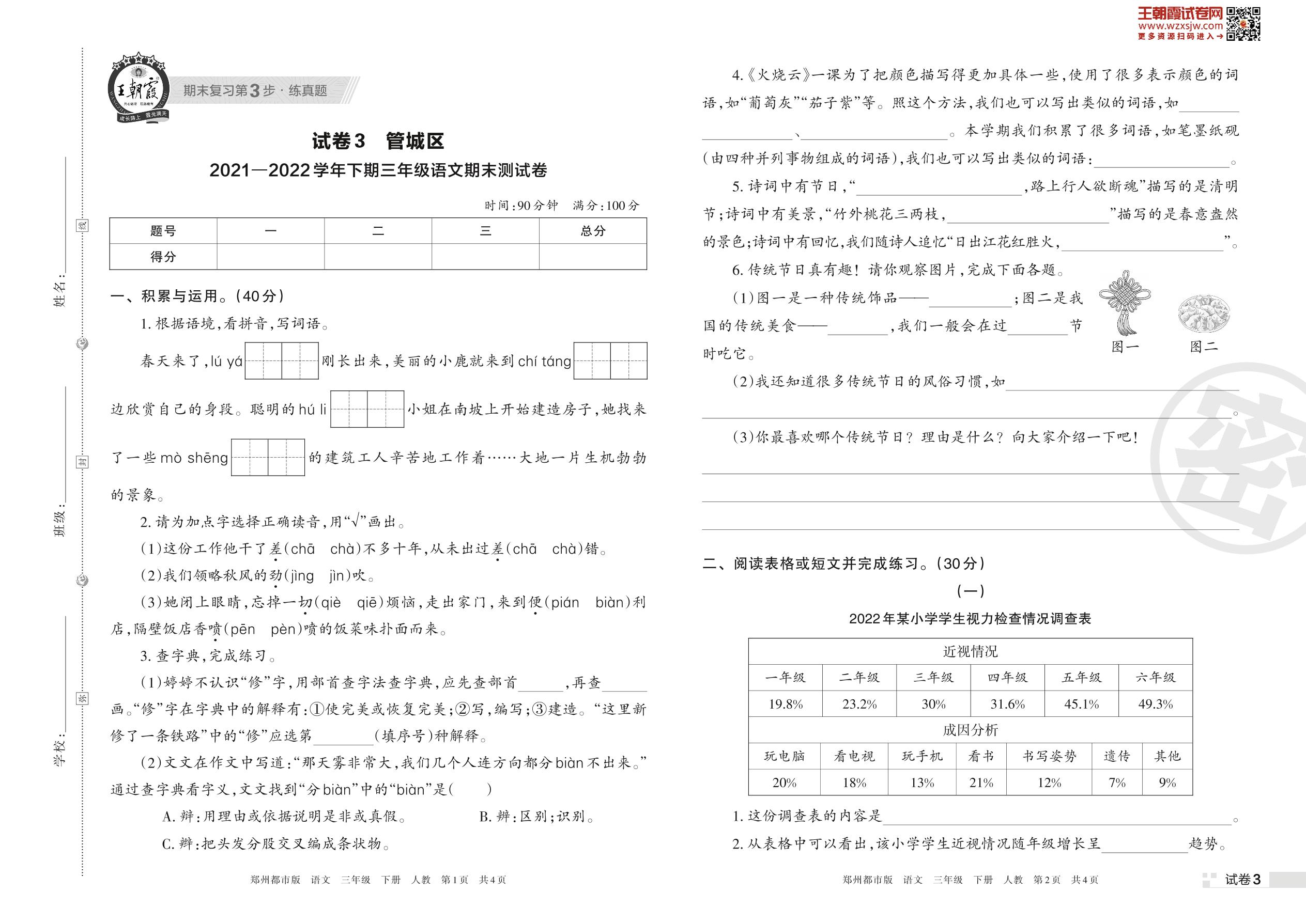 管城区2021—2022学年下期三年级语文期末测试卷(人教版)【3】