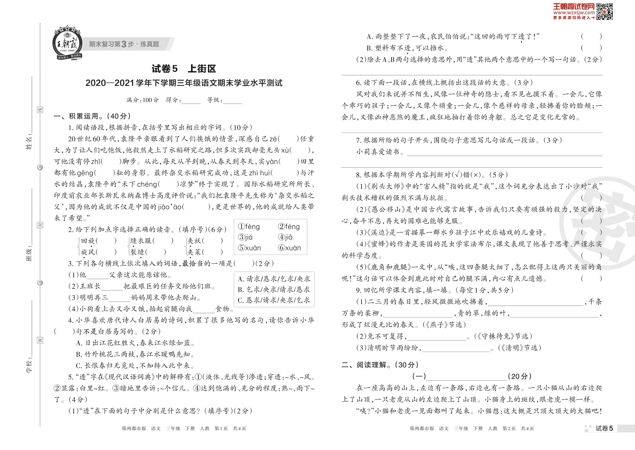 上街区2020—2021学年下学期三年级语文期末学业水平测试(人教版)【5】