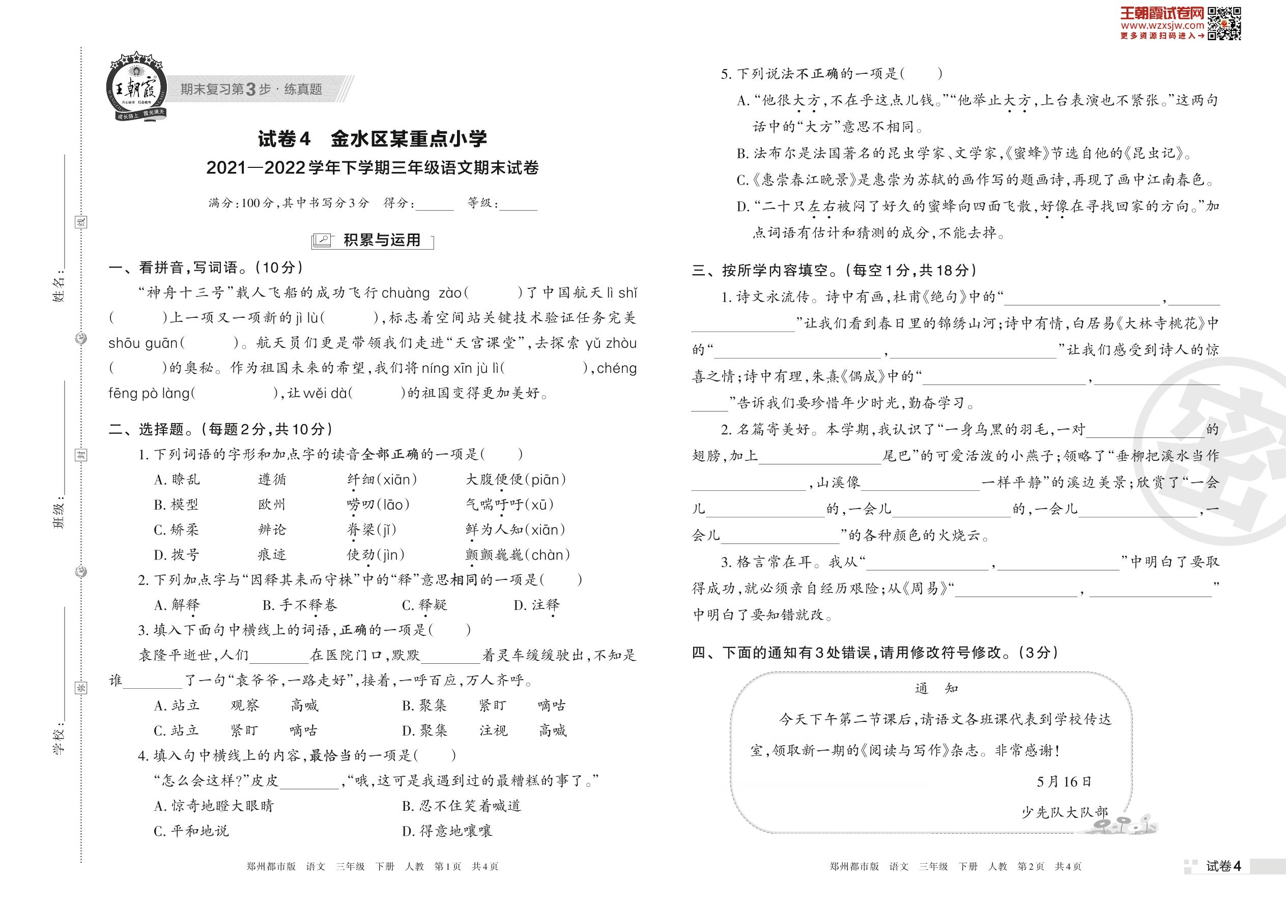 金水区某重点小学2021—2022学年下学期三年级语文期末试卷(人教版)【4】