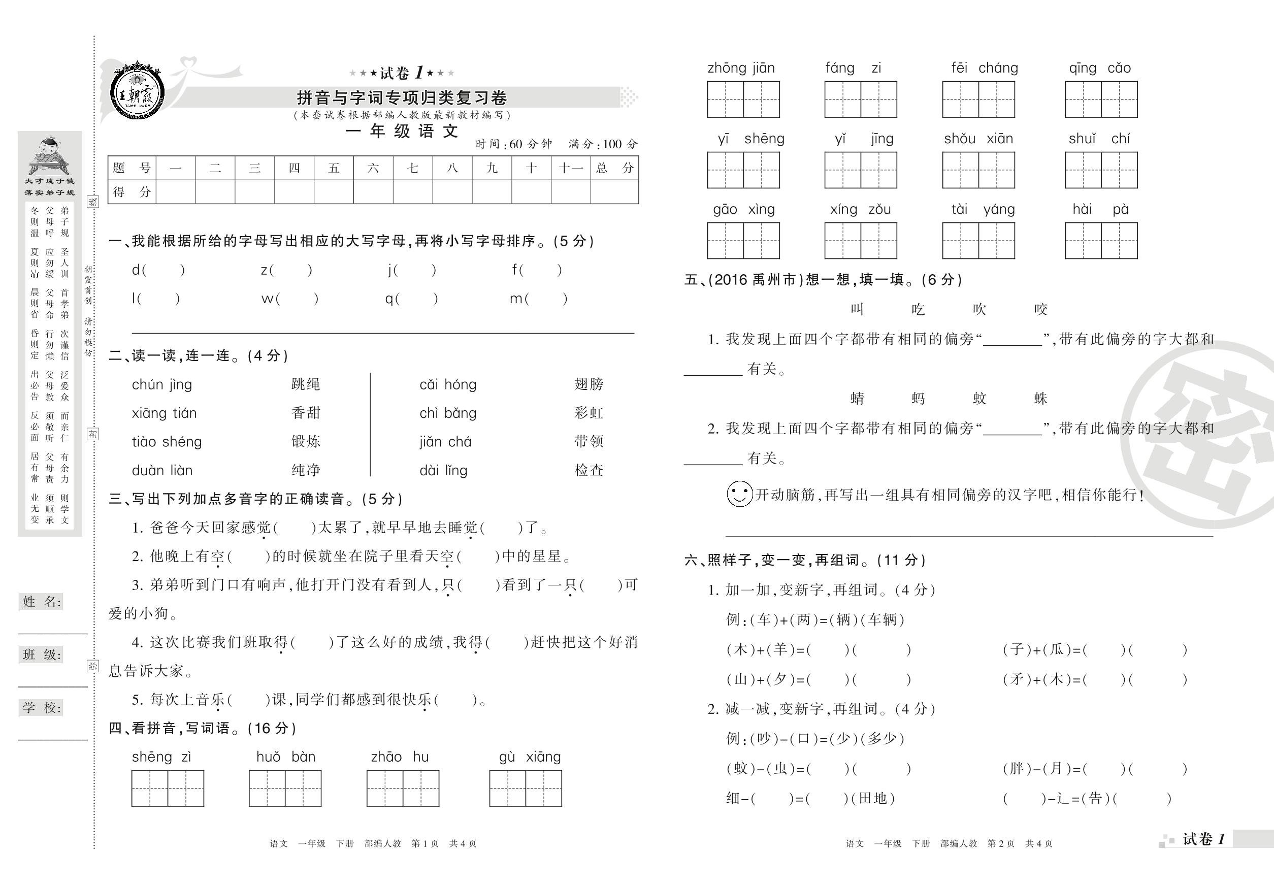 王朝霞期末专项卷——拼音与字词专项归类复习卷一年级下册语文(人教版)_R210731190712【1】