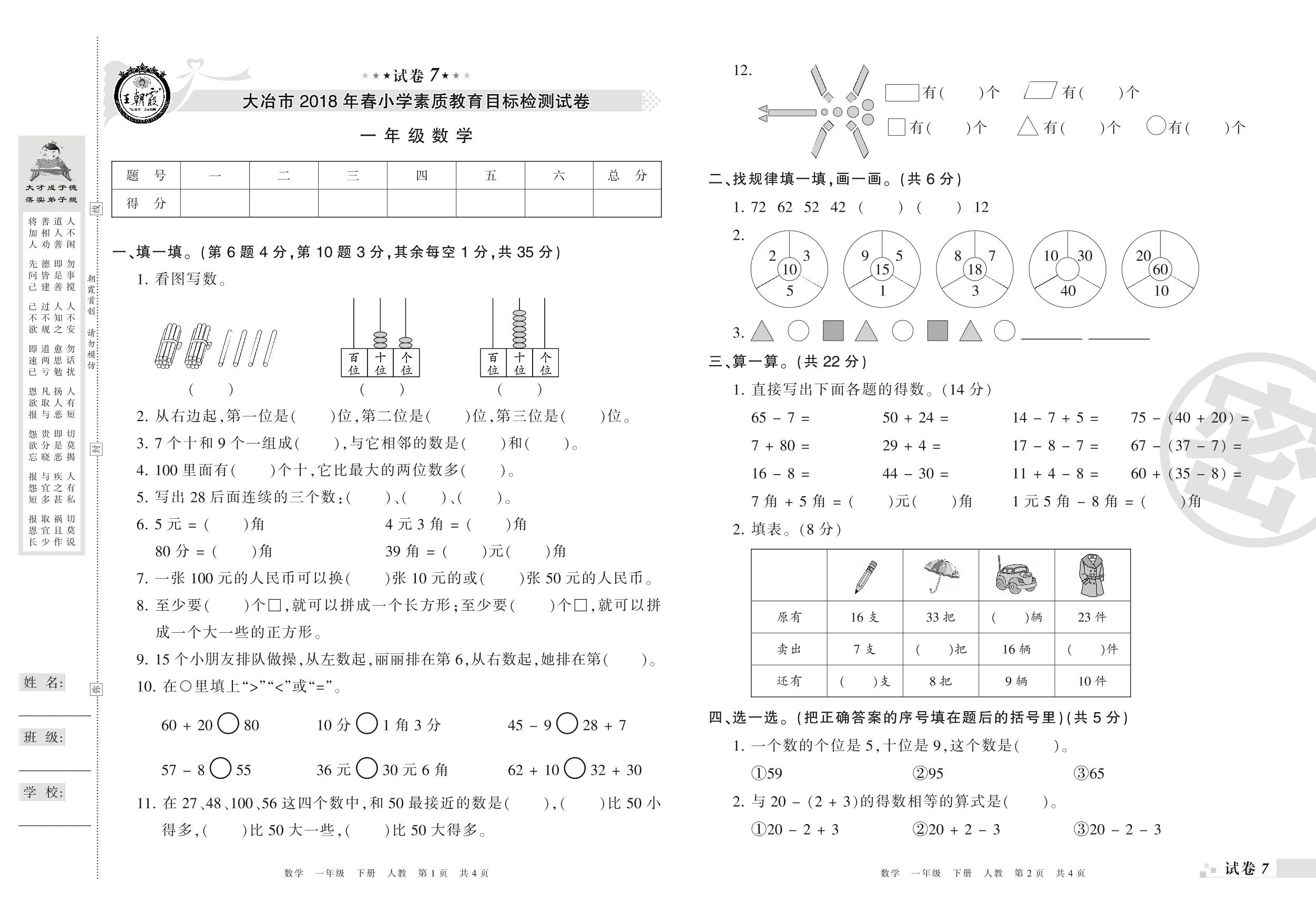 一年级数学人教版下册期末卷