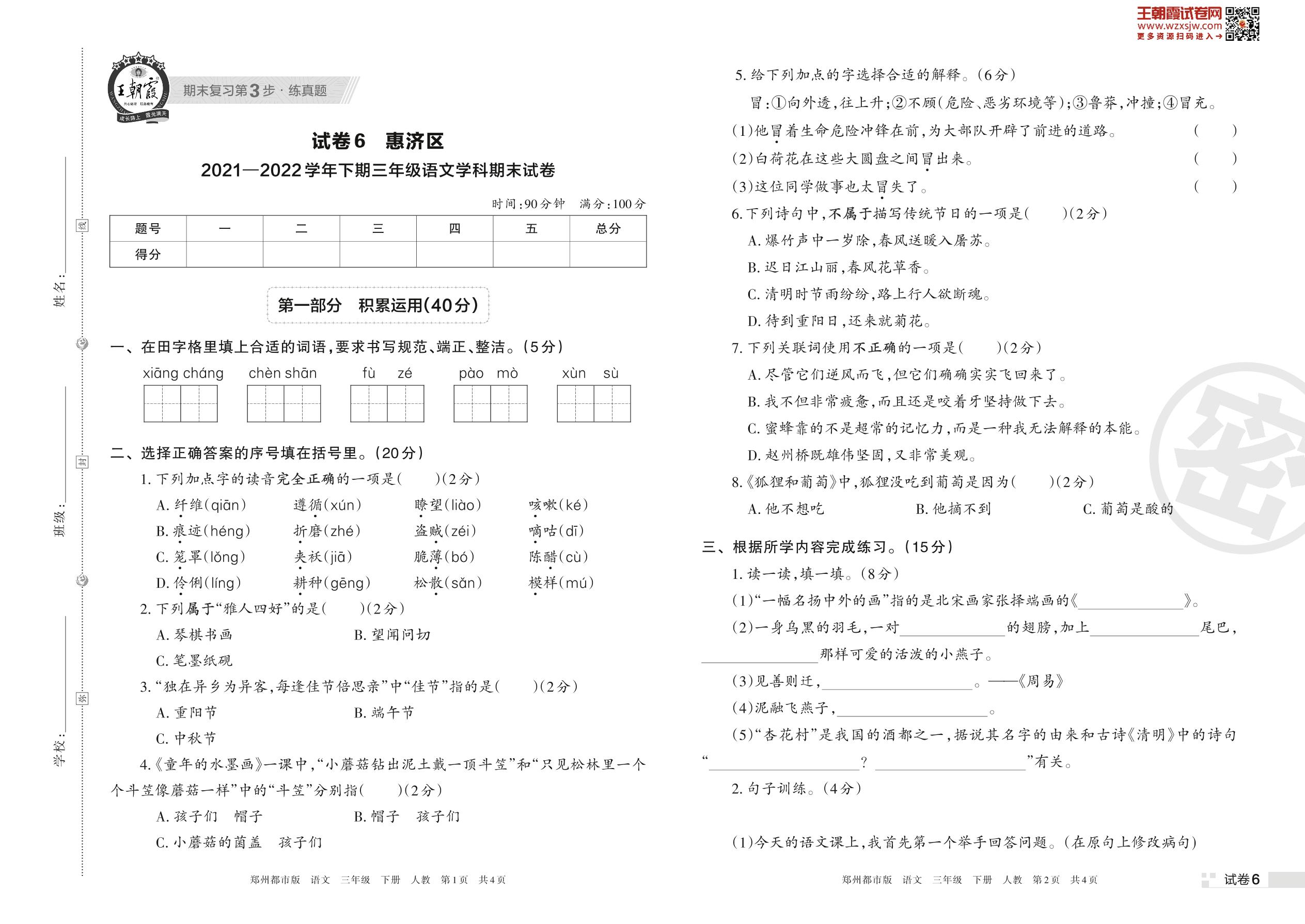 惠济区2021—2022学年下期三年级语文学科期末试卷(人教版)【6】