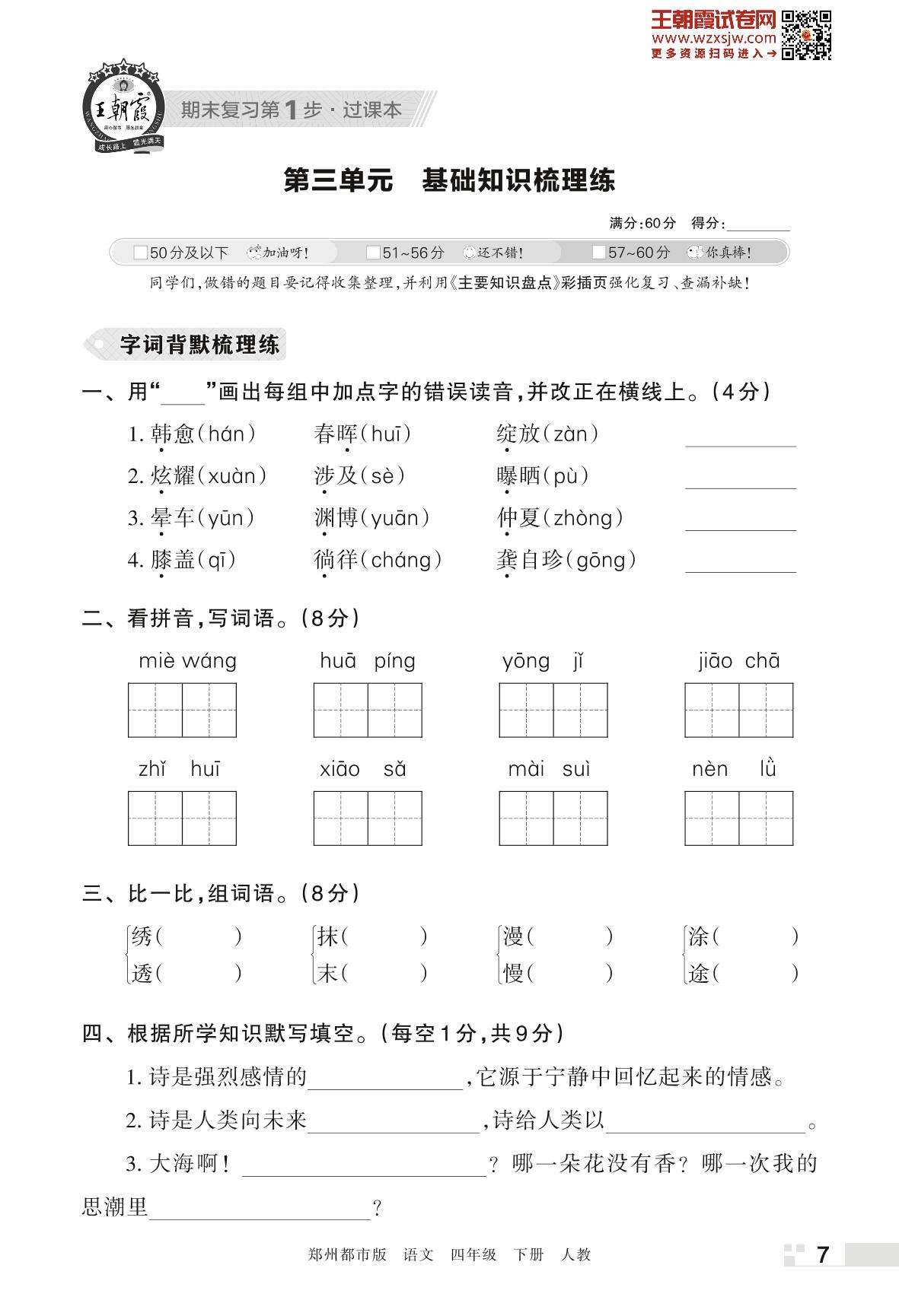 王朝霞期末过课本——第三单元 基础知识梳理练四年级下册语文(人教版)_R230426143157136