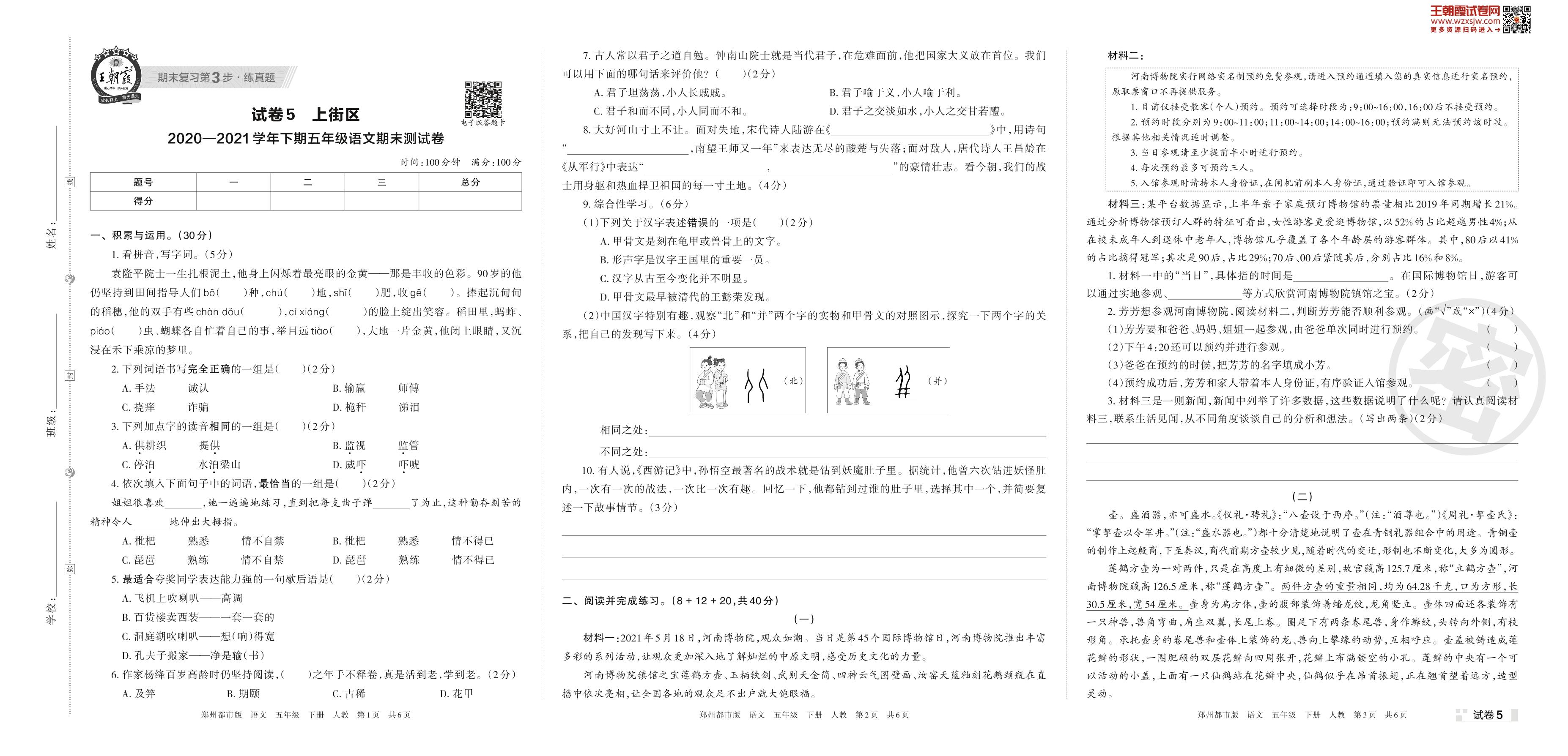 上街区2020—2021学年下期五年级语文期末测试卷(人教版)【5】