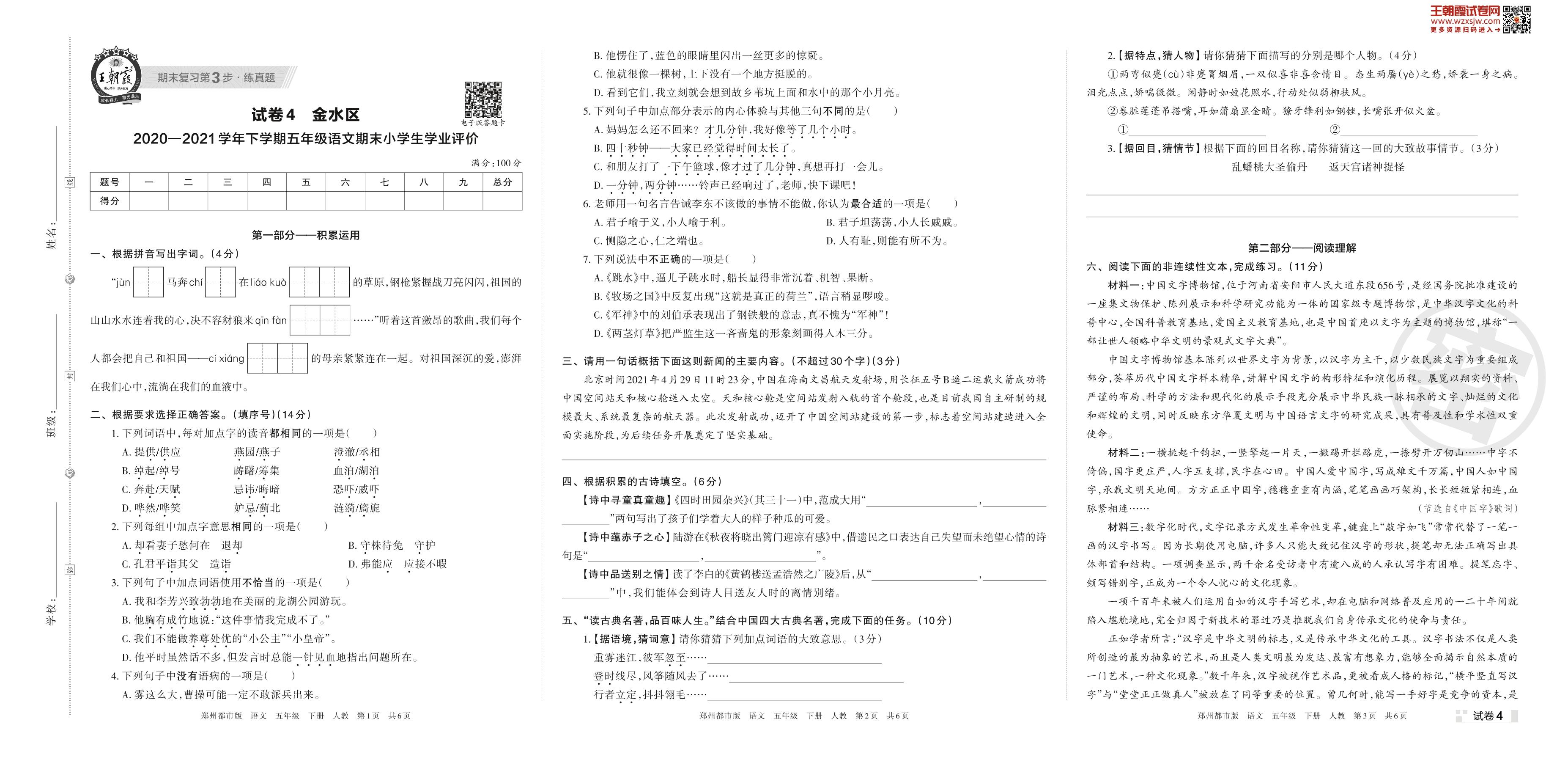 金水区2020—2021学年下学期五年级语文期末小学生学业评价(人教版)【4】