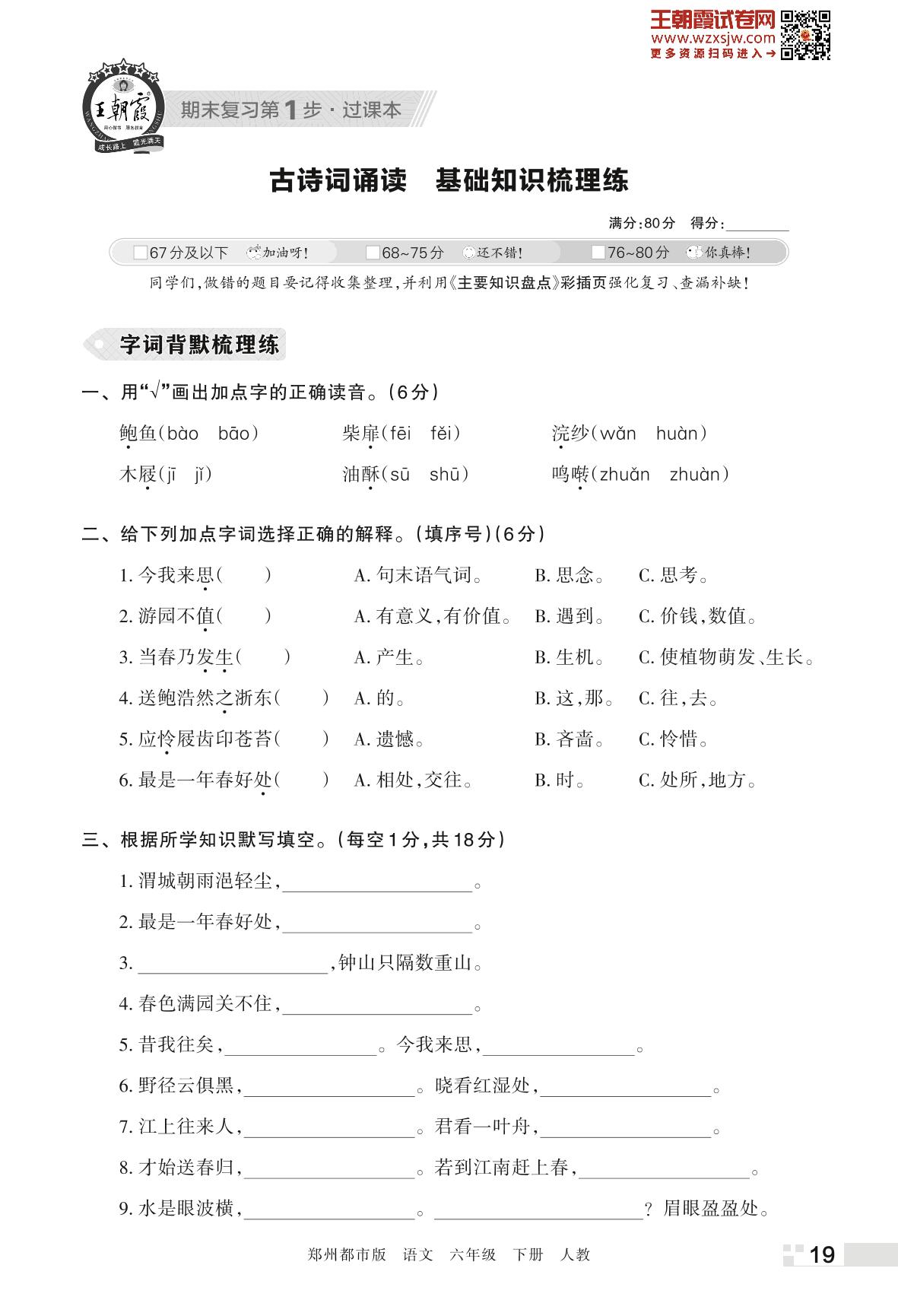 王朝霞期末过课本——古诗词诵读 基础知识梳理练六年级下册语文(人教版)_R230426144121323