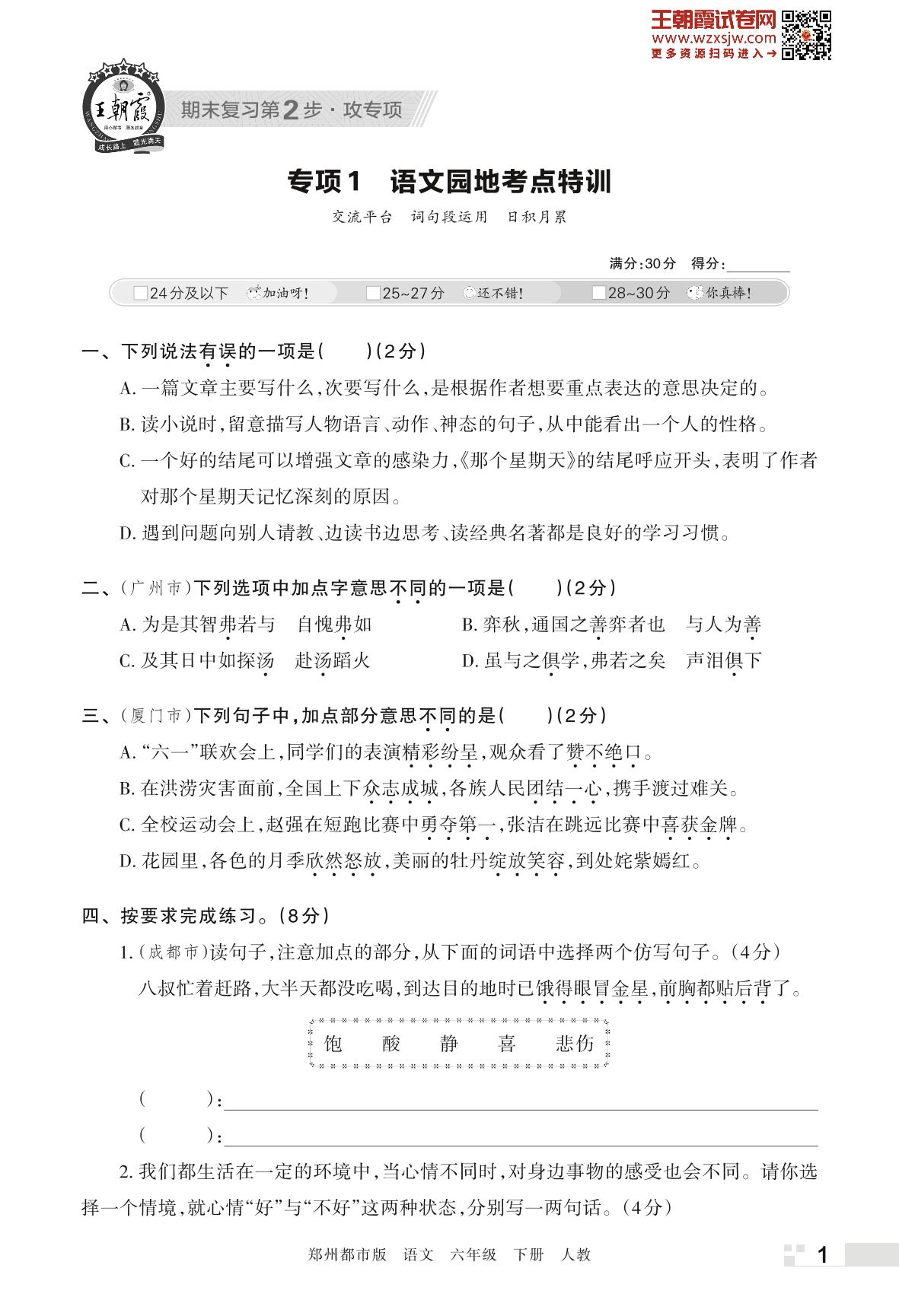 王朝霞期末专项卷——语文园地考点特训六年级下册语文(人教版)_R230426144122417【1】