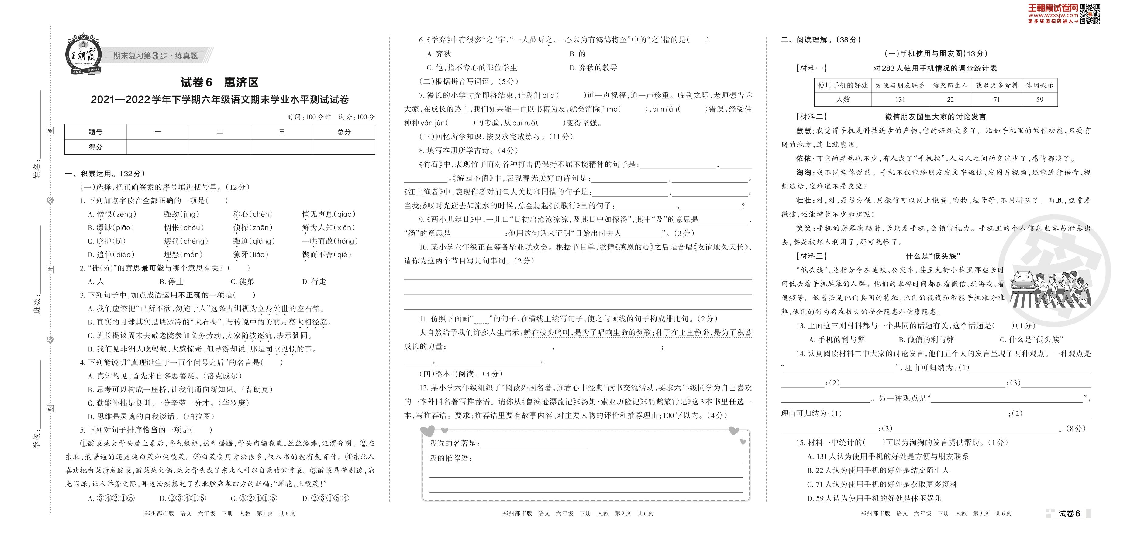 惠济区2021—2022学年下学期六年级语文期末学业水平测试试卷(人教版)【6】