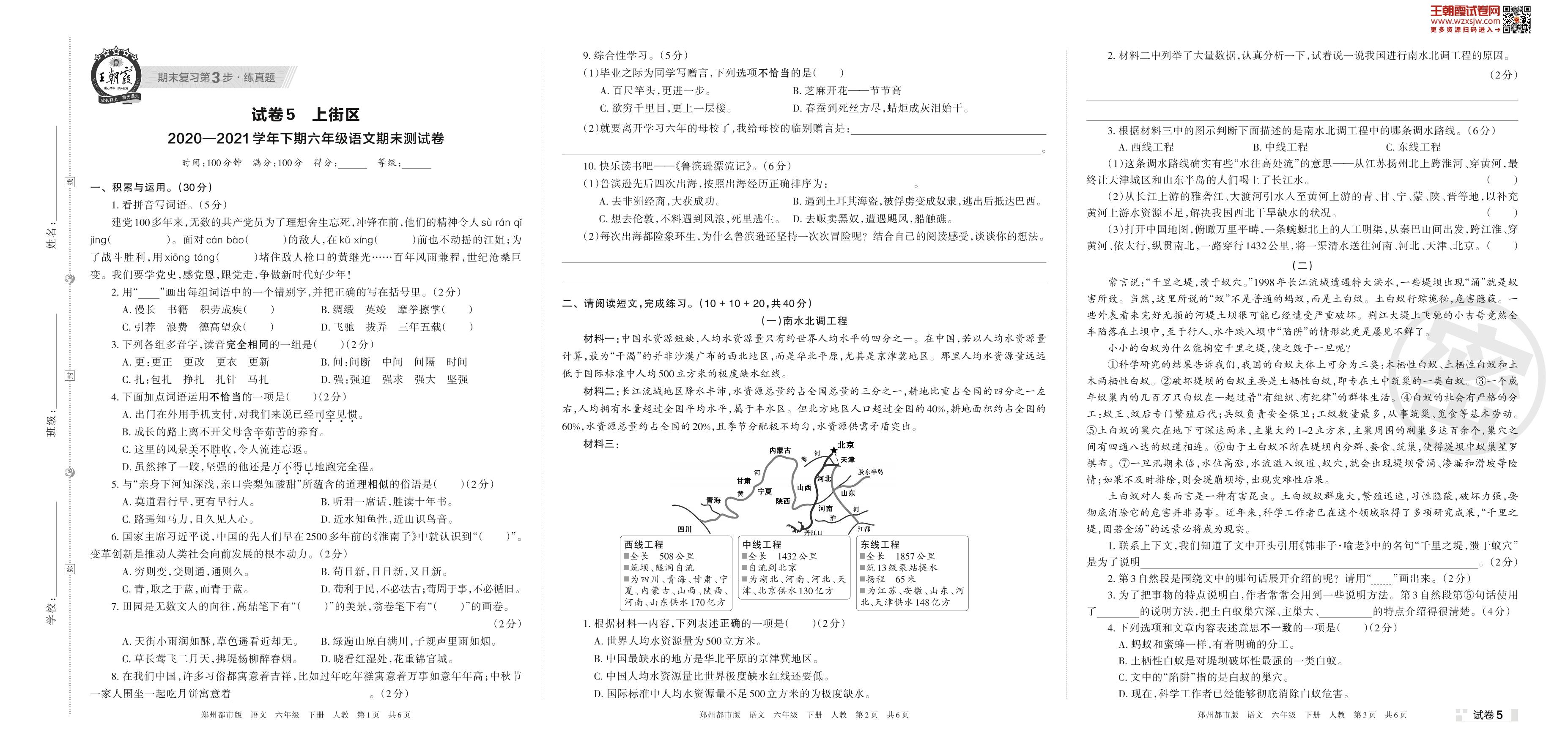 上街区2020—2021学年下期六年级语文期末测试卷(人教版)【5】