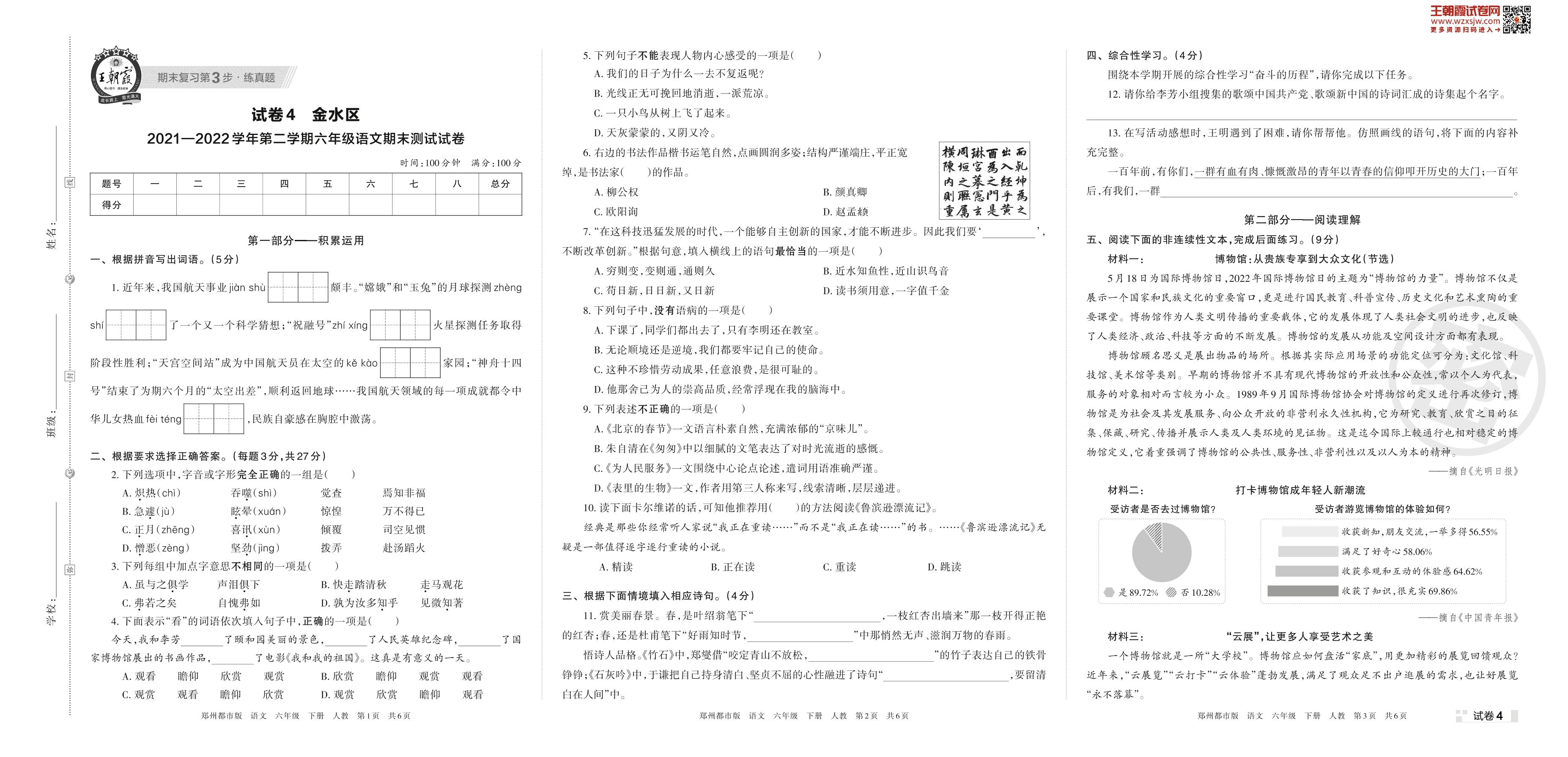 金水区2021—2022学年第二学期六年级语文期末测试试卷(人教版)【4】