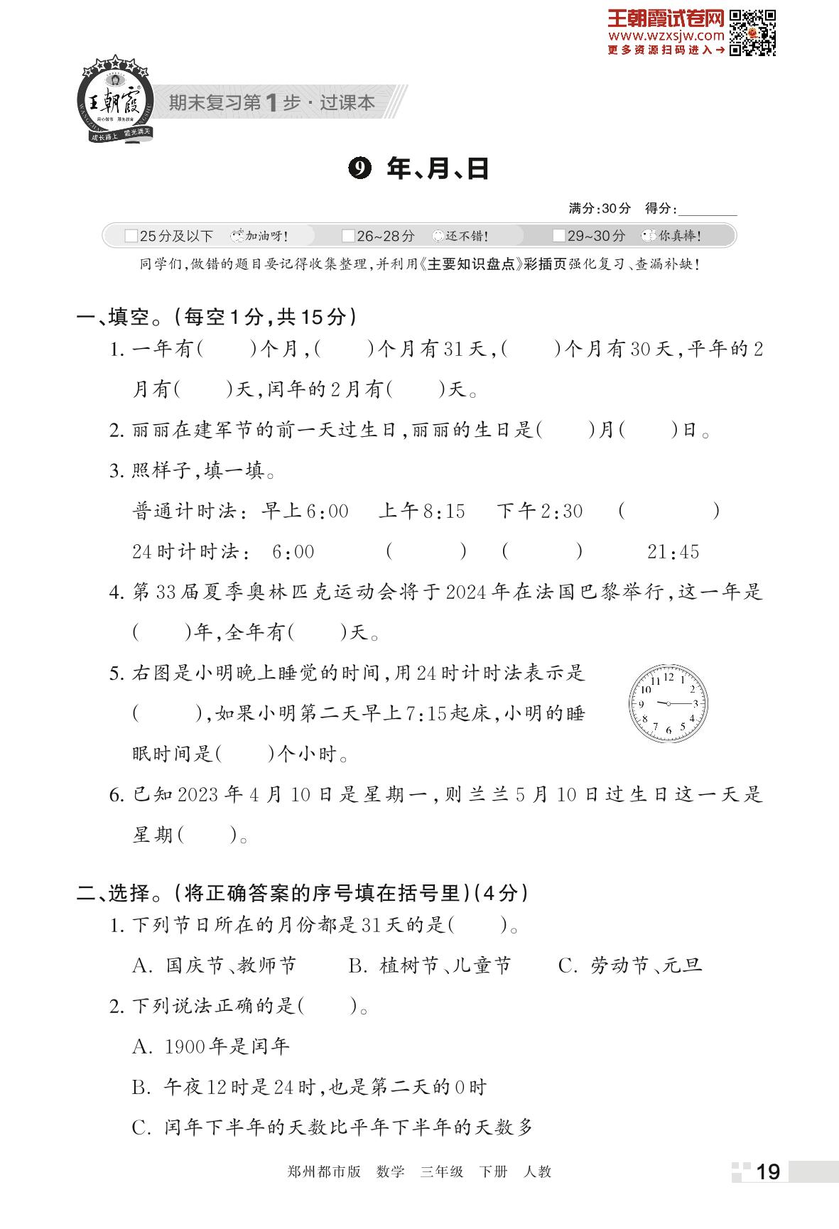 王朝霞期末过课本——9 年、月、日三年级下册数学(人教版)_R230426145502706