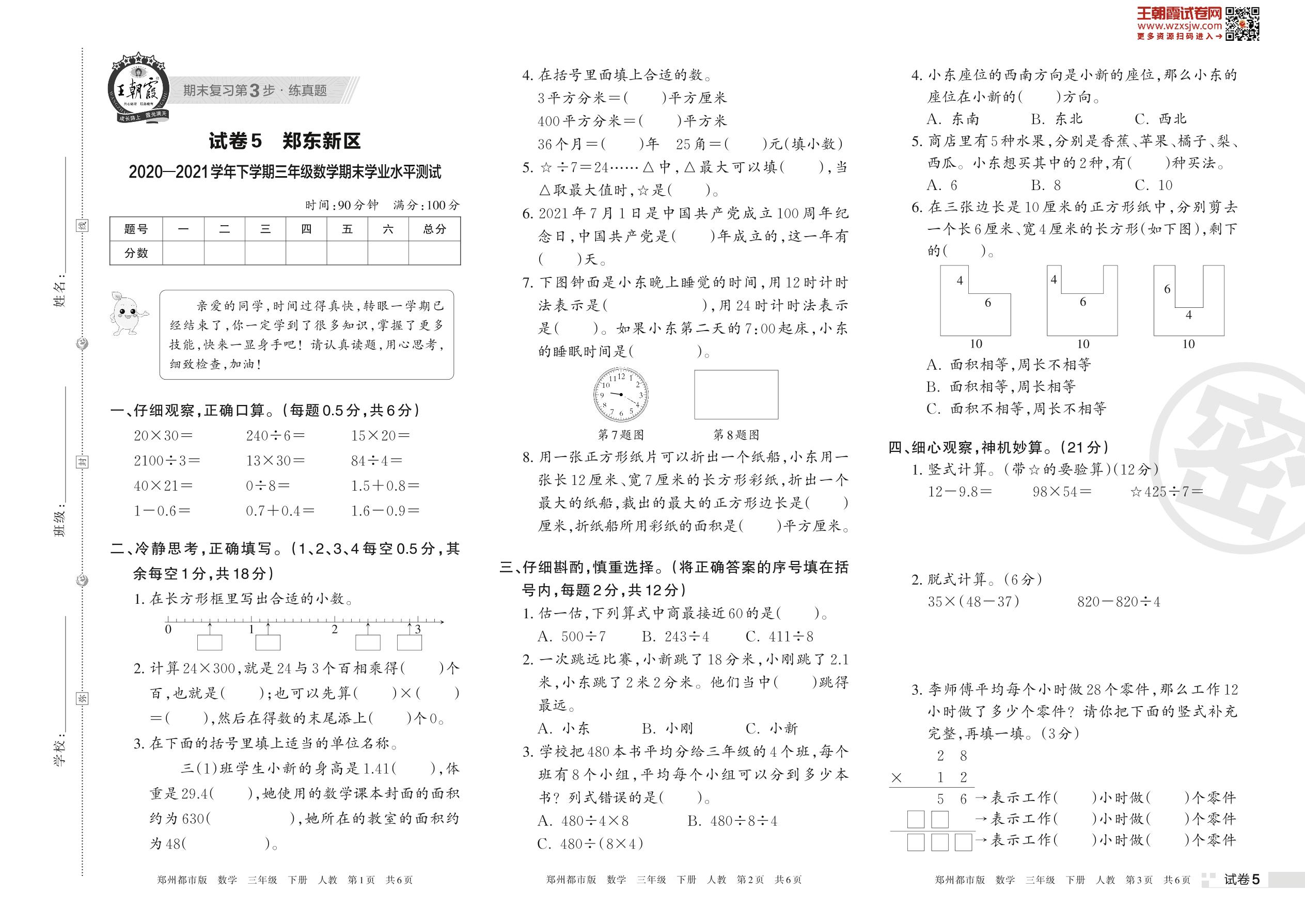 郑东新区2020—2021学年下学期三年级数学期末学业水平测试(人教版)【5】