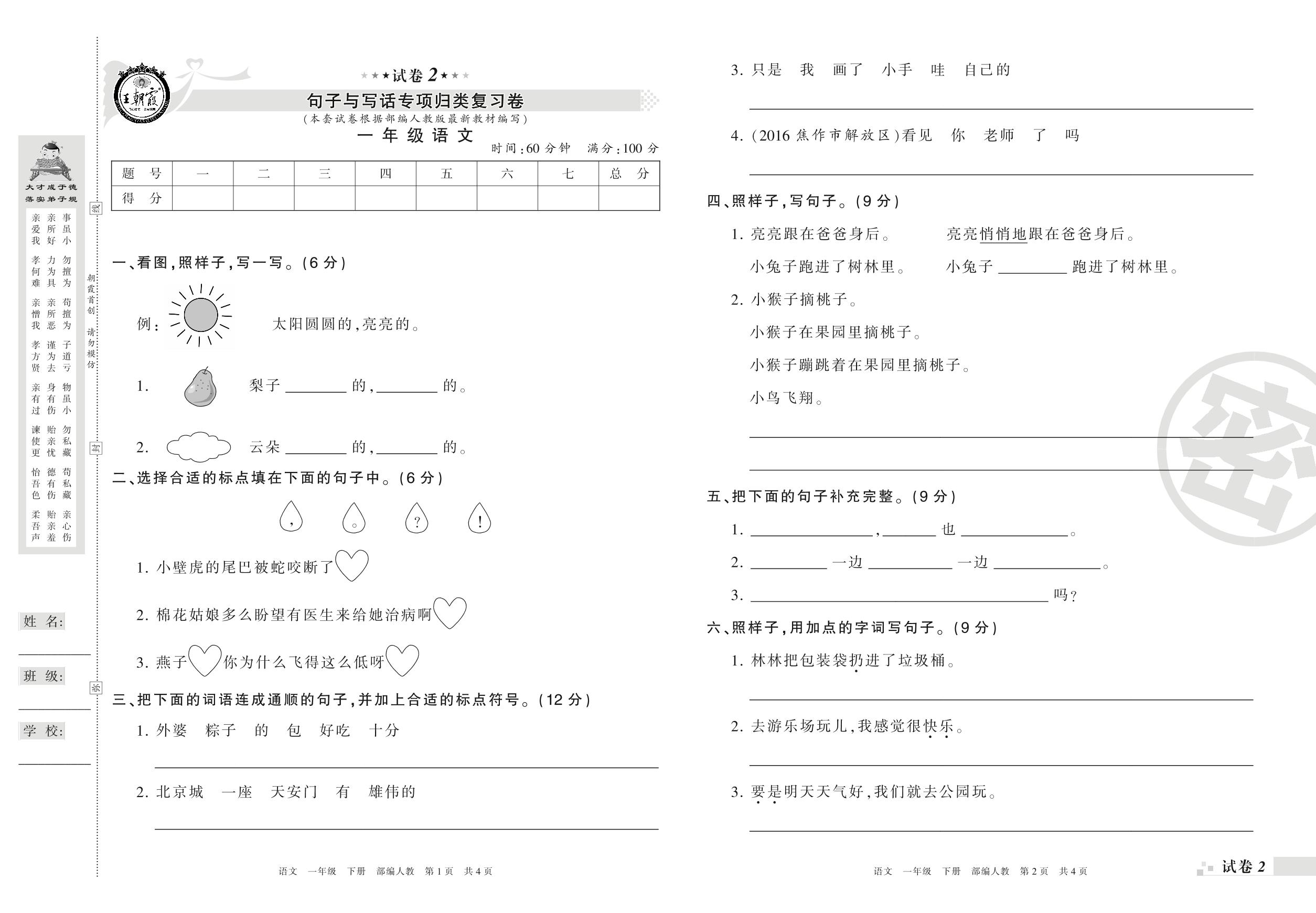 王朝霞期末专项卷——句子与写话专项归类复习卷一年级下册语文(人教版)_R210731190715【2】