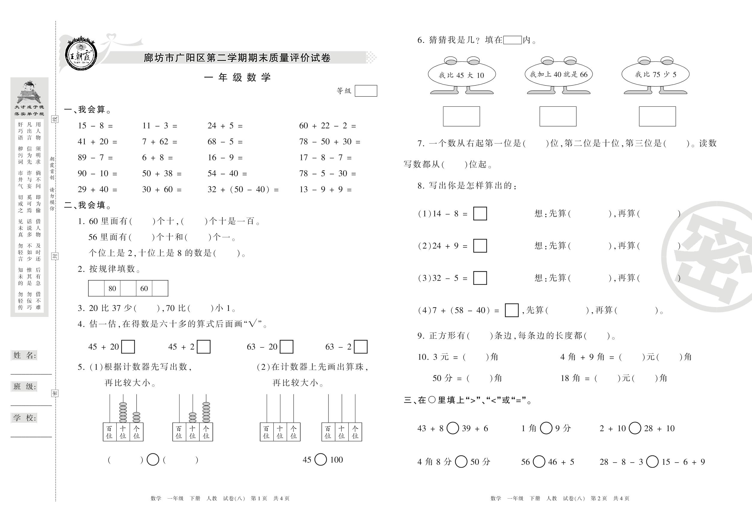 2015-2016学年第二学期廊坊市广阳区一年级数学试卷(人教版)【8】