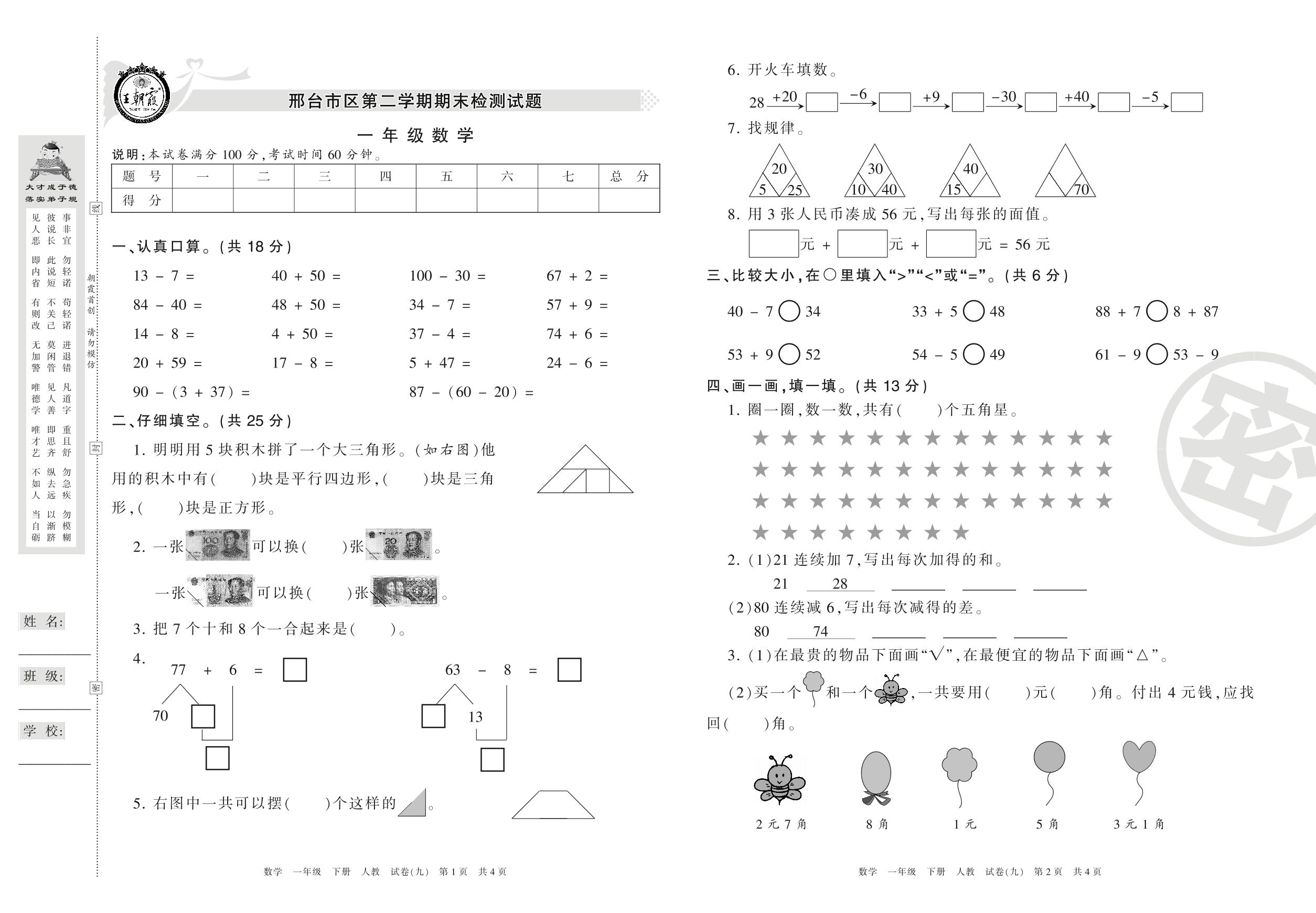 2015-2016学年第二学期邢台市一年级数学试卷(人教版)【9】