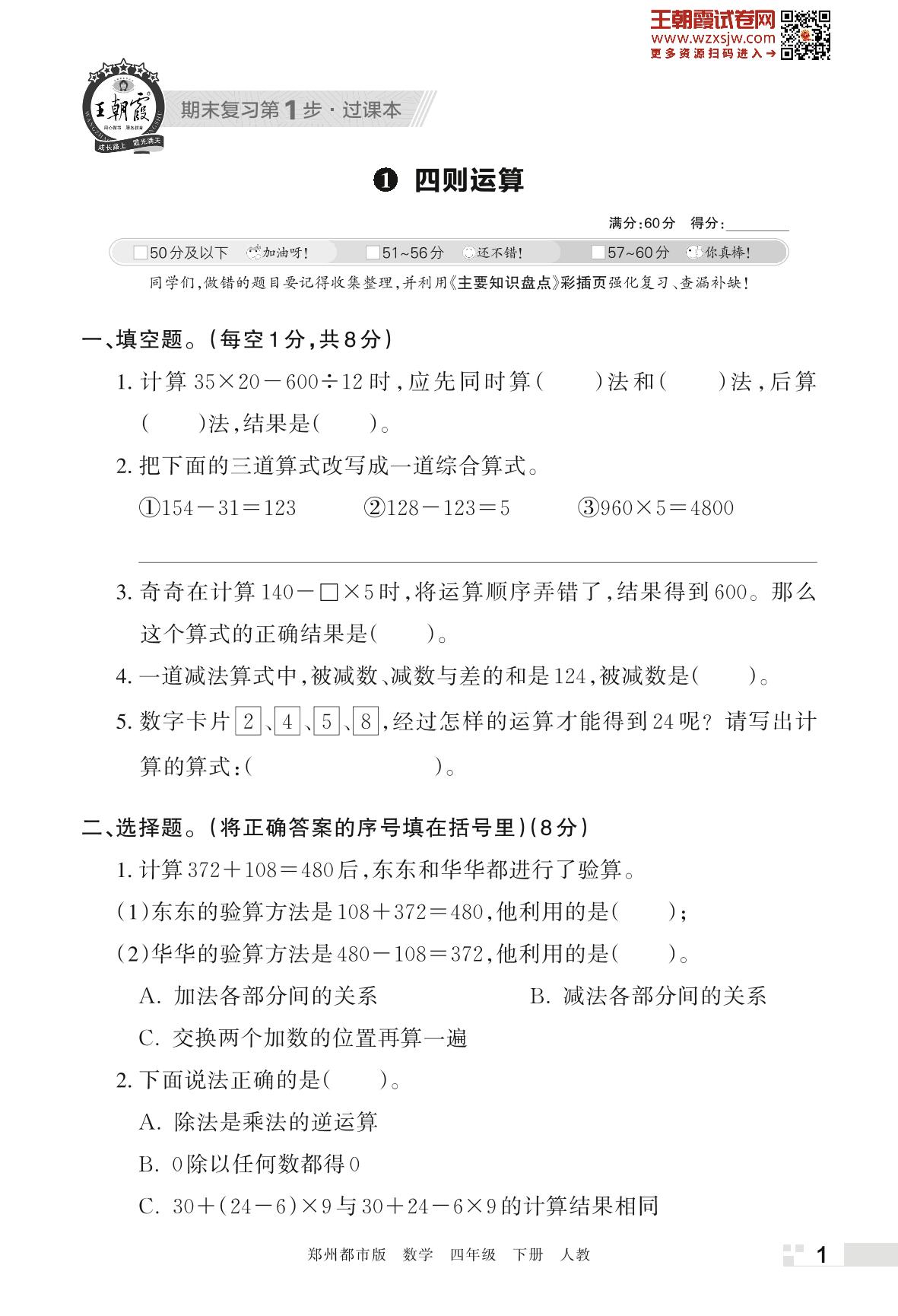 王朝霞期末过课本——1 四则运算四年级下册数学(人教版)_R230426150205752