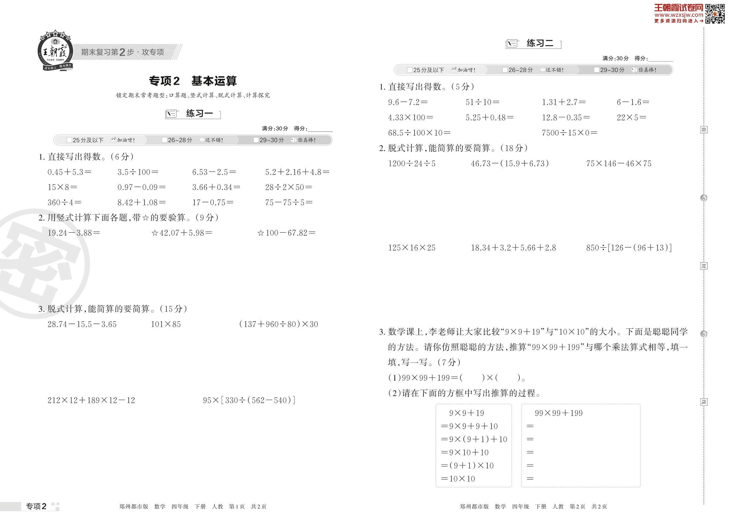 王朝霞期末专项卷——基本运算四年级下册数学(人教版)_R230426150205977【2】