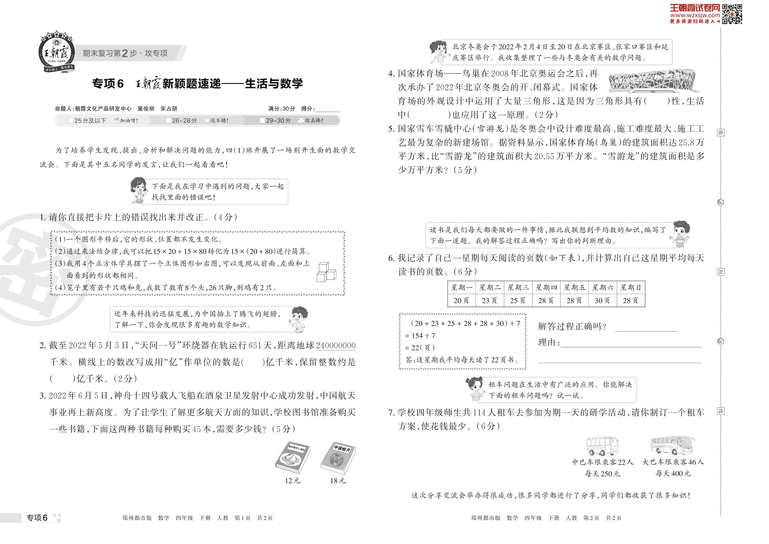 王朝霞期末专项卷——王朝霞新颖题速递:生活与数学四年级下册数学(人教版)_R230426150205552【6】