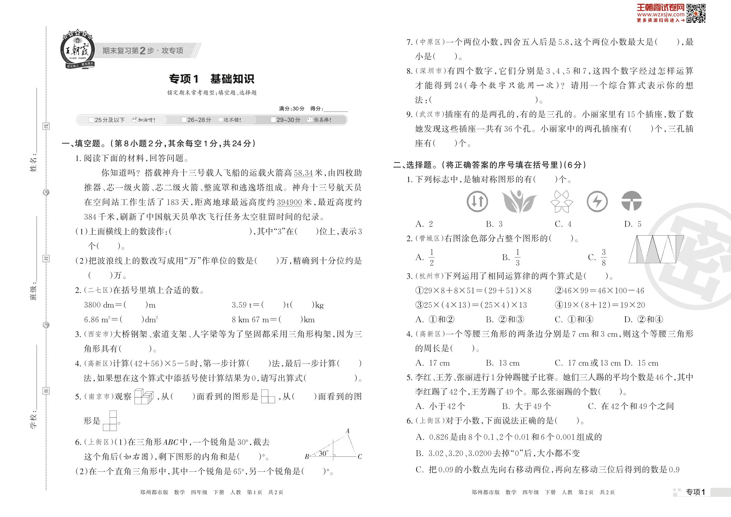 王朝霞期末专项卷——基础知识四年级下册数学(人教版)_R230426150206559【1】